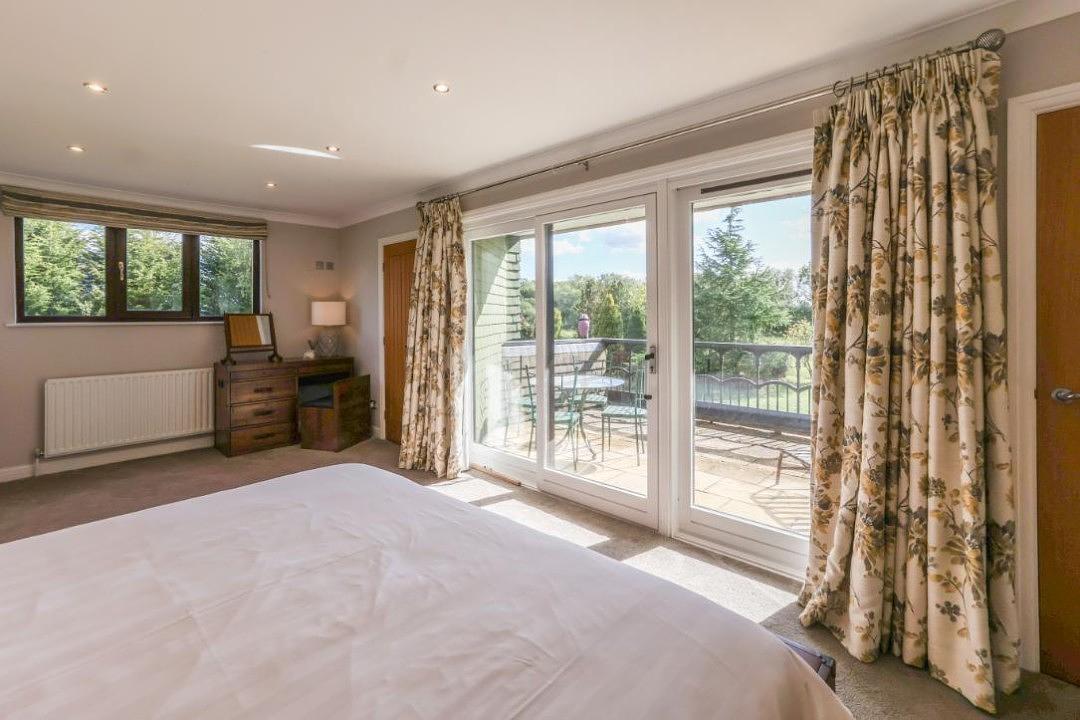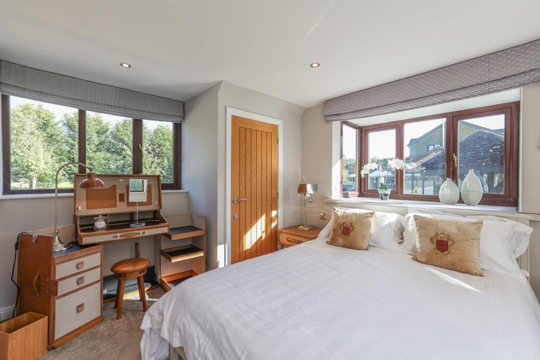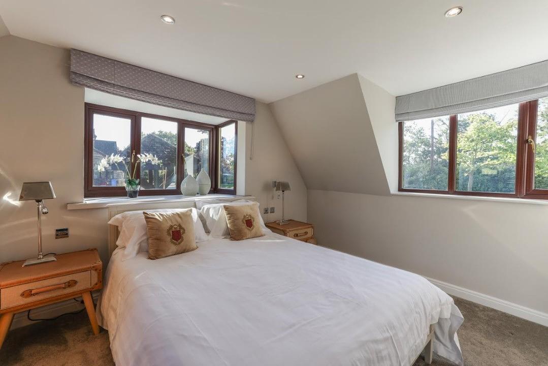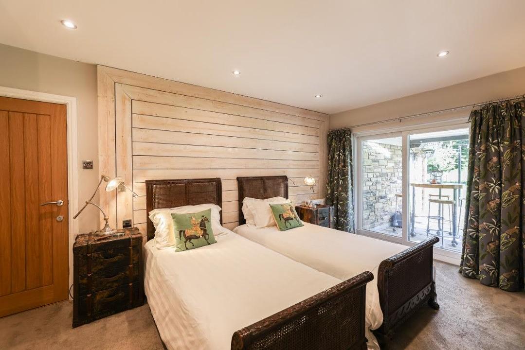 Bedroom 1, located on the ground floor, features colonial-style décor with antique Bergère single beds and direct access to the veranda. Its en suite bathroom is a spacious wet room, ideal for guests with mobility issues. Bedroom 2, also on the ground floor, is furnished in a French country style with a king-size bed and views over the sun terrace. Its en suite includes a contemporary walk-in shower and a vanity wash area. The Master Suite, Bedroom 3, located on the first floor, is the largest room, featuring a super-king bed and two walk-in wardrobes. The en suite is equipped with a large walk-in shower, offering ample space for two. Bedroom 4, also on the first floor, has a king-size bed and views over the sun terrace. Its en suite is a contemporary suite with a walk-in shower. Bedroom 5, in a Scottish Highland theme, has a king-size bed and an en suite with a walk-in shower. Bedrooms 6 and 7 are in The Chalet annexe on the ground floor, both featuring king-size beds and luxurious en suites with walk-in showers. Each bedroom and en suite has been thoughtfully designed to offer comfort and style for every guest.
