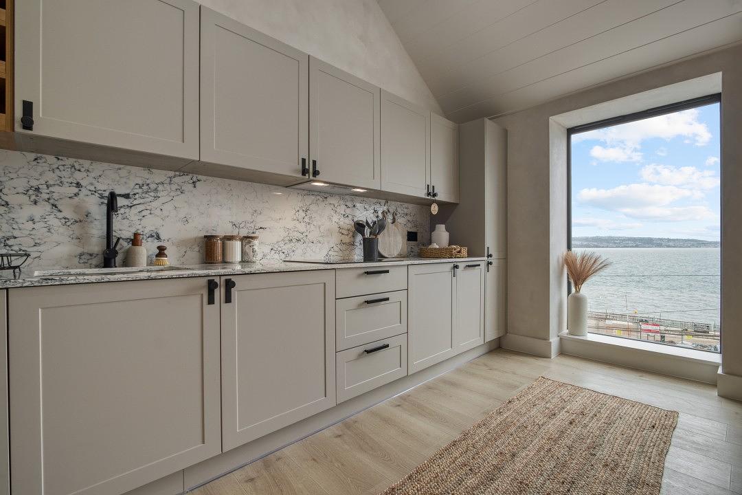 This newly renovated penthouse apartment offers an open-plan living area with double-height vaulted ceilings, making it a spacious and airy retreat. The lounge and kitchen are bathed in natural light thanks to the floor-to-ceiling windows, which frame the stunning, uninterrupted sea views of Mumbles Bay. For entertainment, both the lounge and master bedroom are equipped with 55-inch smart TVs. The kitchen comes fully equipped with modern appliances, including a Nespresso machine, dishwasher, and washing machine, ensuring a comfortable stay.