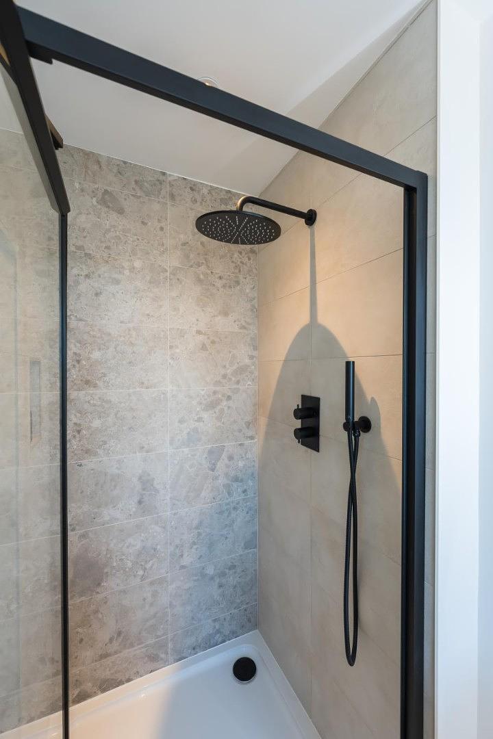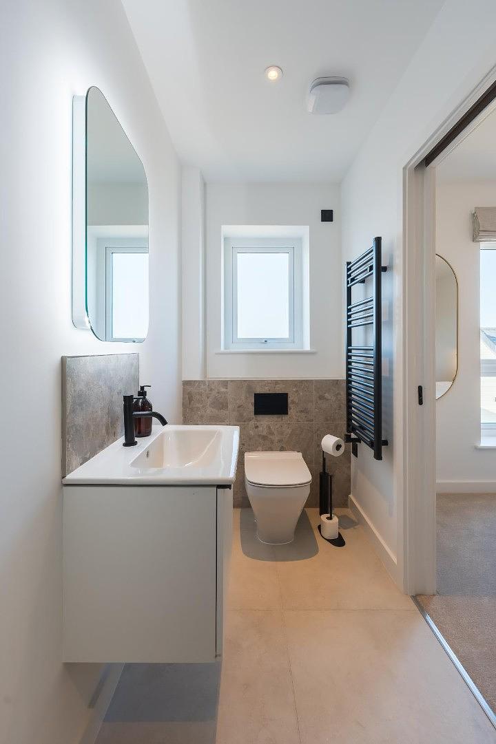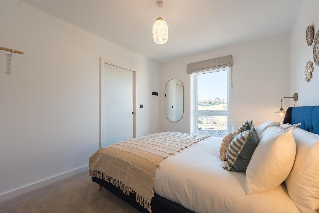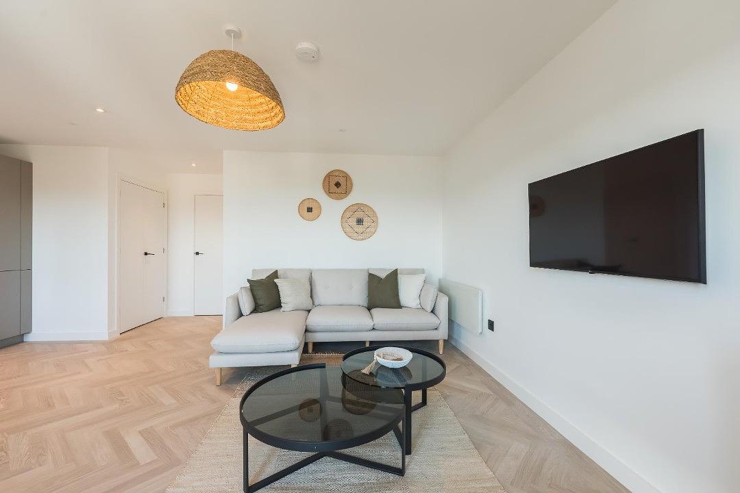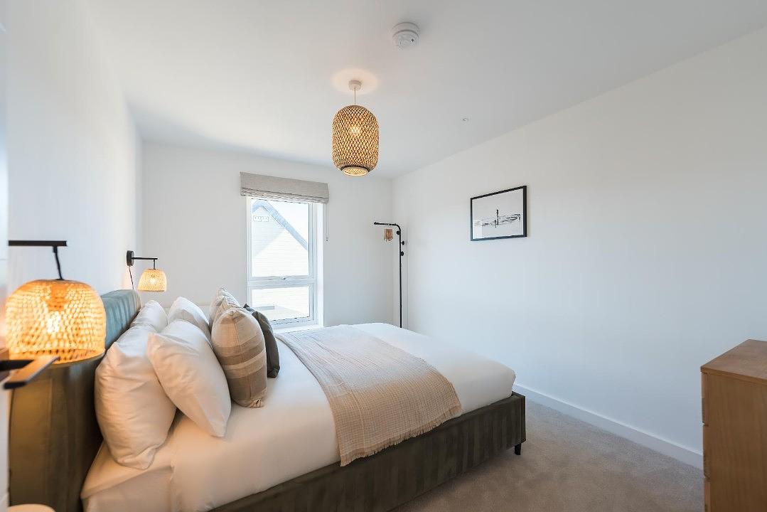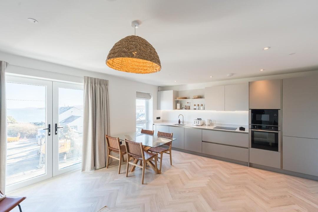 Each apartment features two spacious bedrooms with king-size beds and private ensuites, one with a bath for extra indulgence and both with walk-in showers—ideal for refreshing after a coastal adventure. The open-plan design and high ceilings bring in plenty of natural light, creating a bright, airy feel throughout.