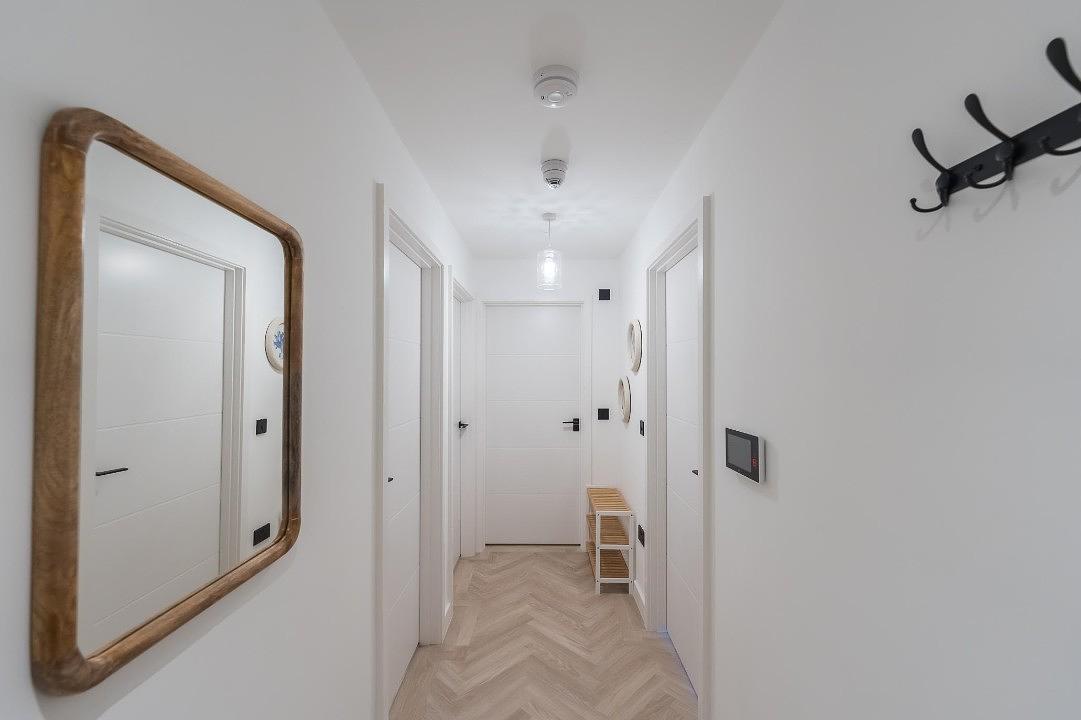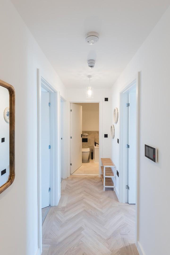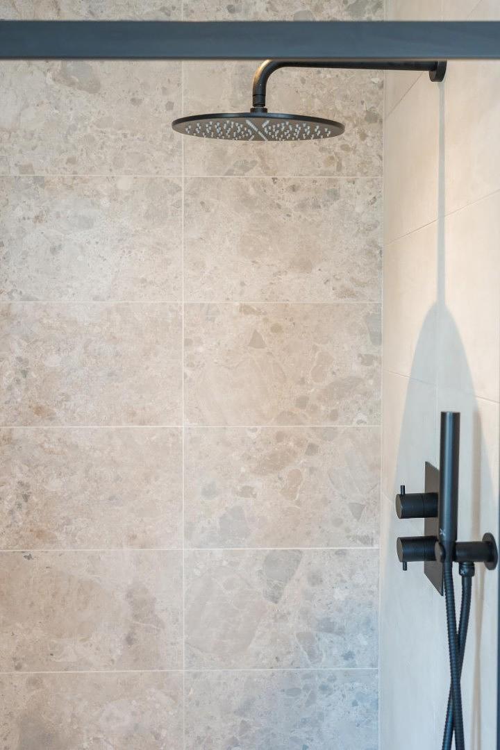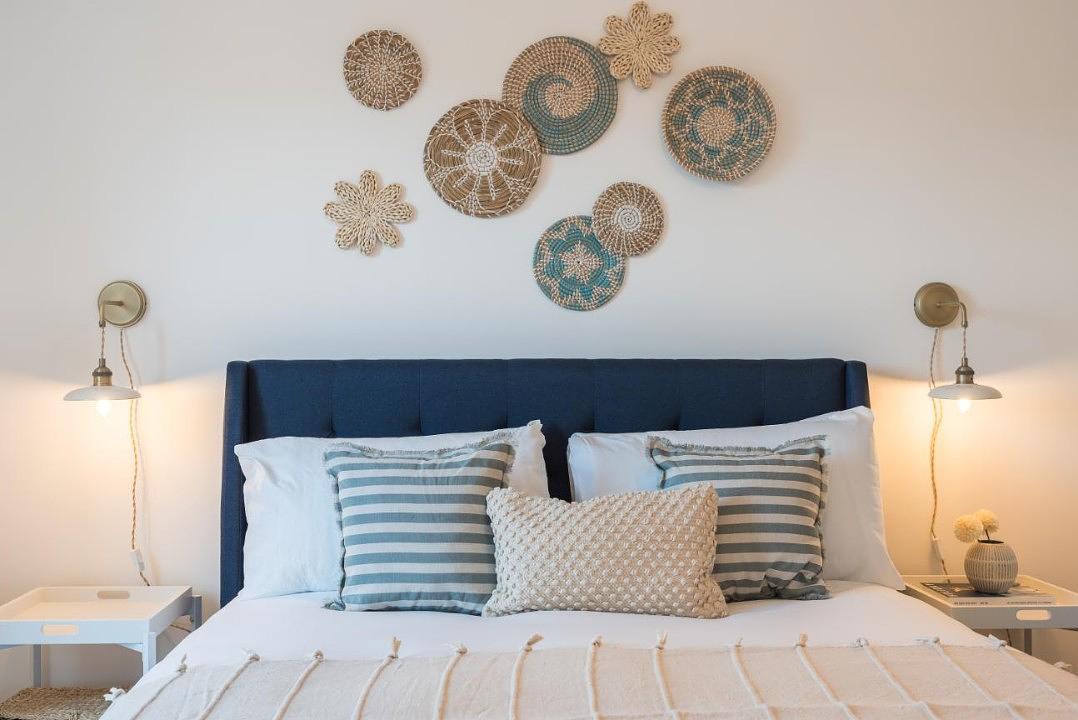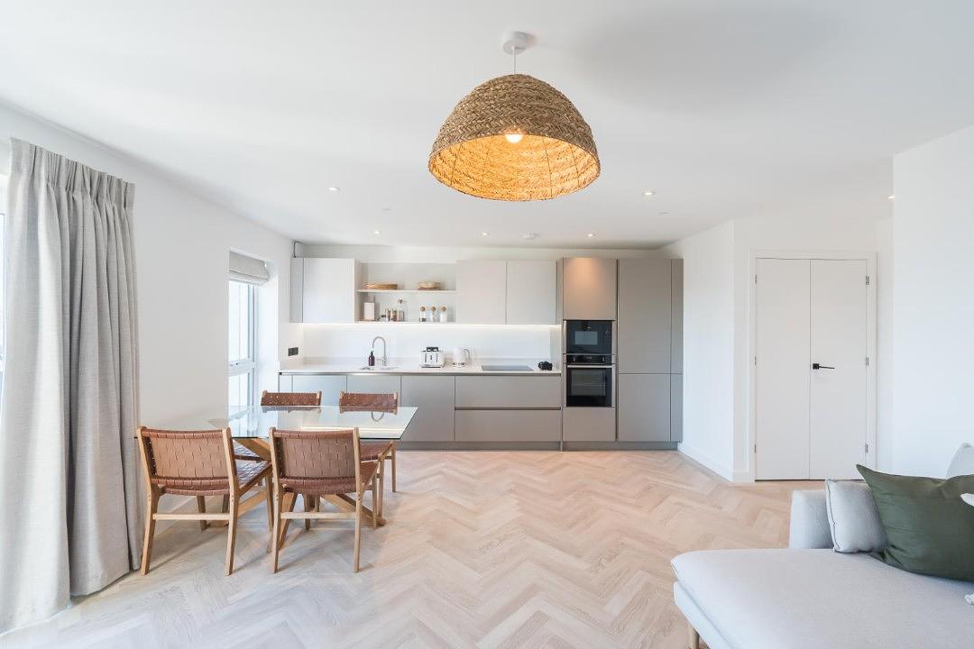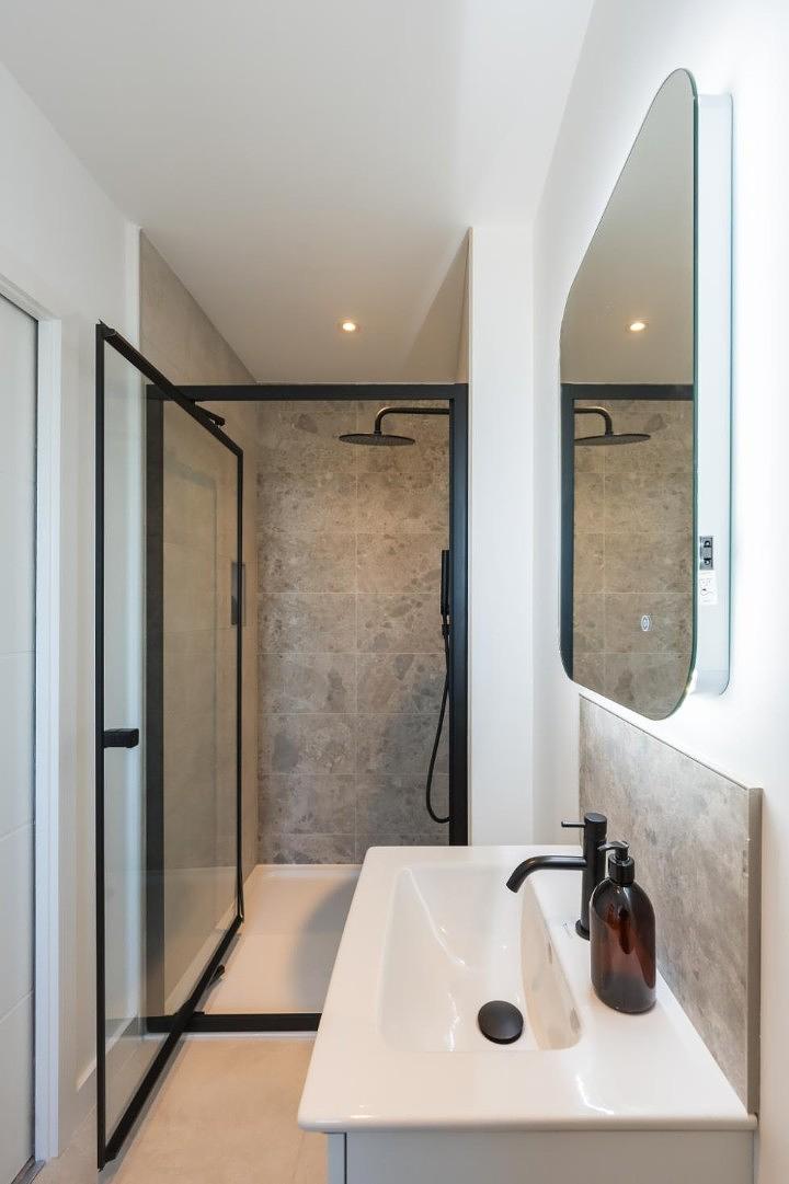 Each apartment features two spacious bedrooms with king-size beds and private ensuites, one with a bath for extra indulgence and both with walk-in showers—ideal for refreshing after a coastal adventure. The open-plan design and high ceilings bring in plenty of natural light, creating a bright, airy feel throughout.