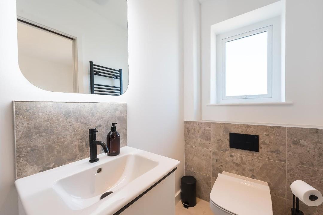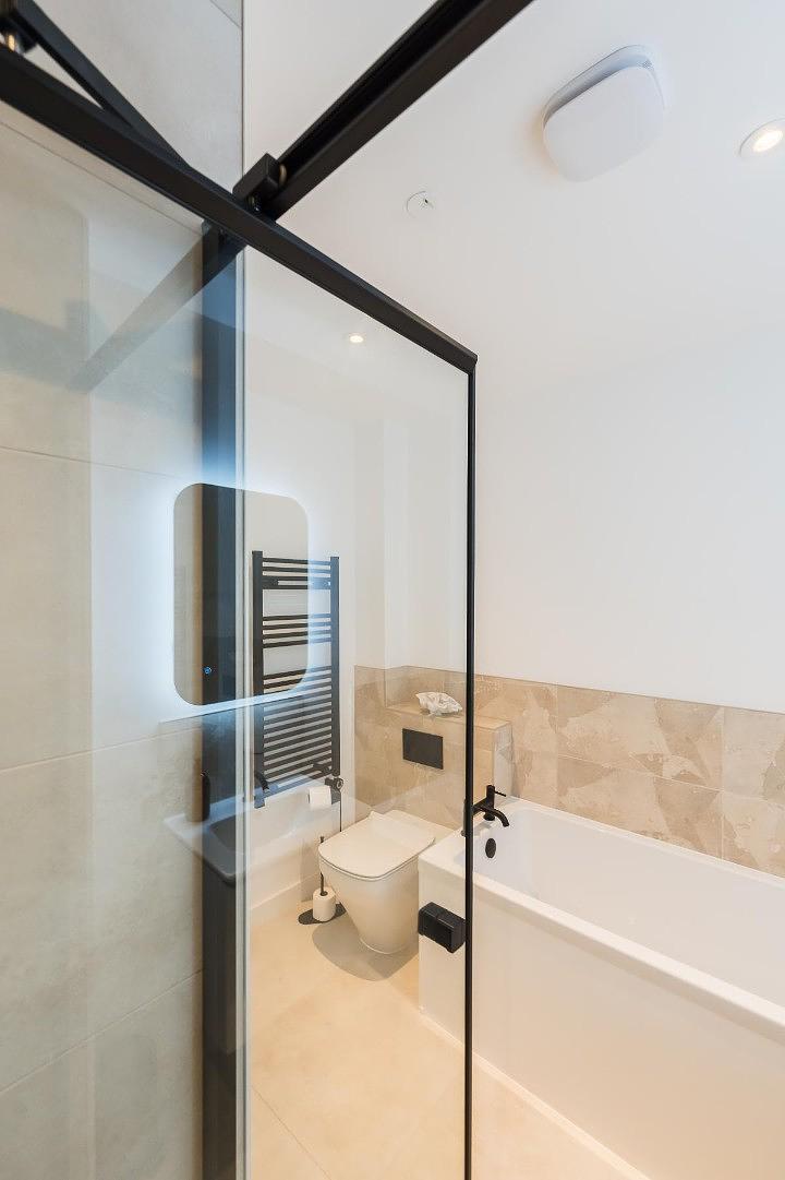 The apartment’s open-plan design, high ceilings, and fresh, modern décor create a light, spacious feel throughout. Each of the two king-size bedrooms comes with its own ensuite—one with a luxurious bath, both with showers—giving everyone their own private space to relax.