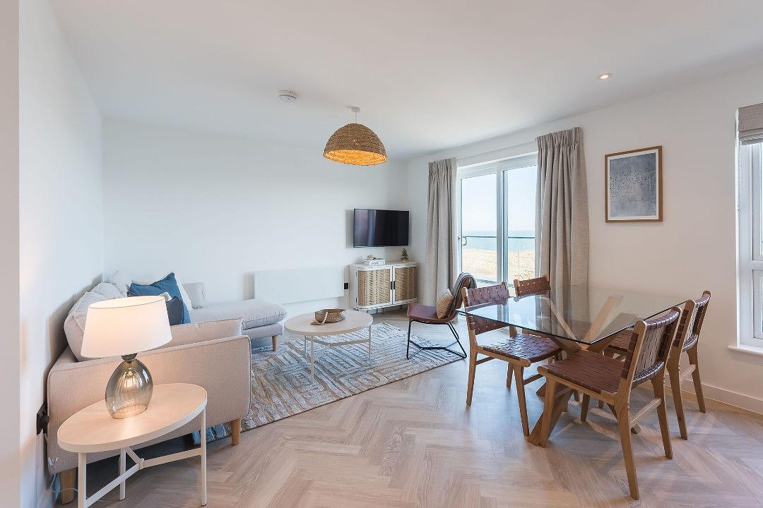 The apartment features two spacious bedrooms with king-size beds and private ensuites, one with a bath for extra indulgence and both with walk-in showers—ideal for refreshing after a coastal adventure. The open-plan design and high ceilings bring in plenty of natural light, creating a bright, airy feel throughout.