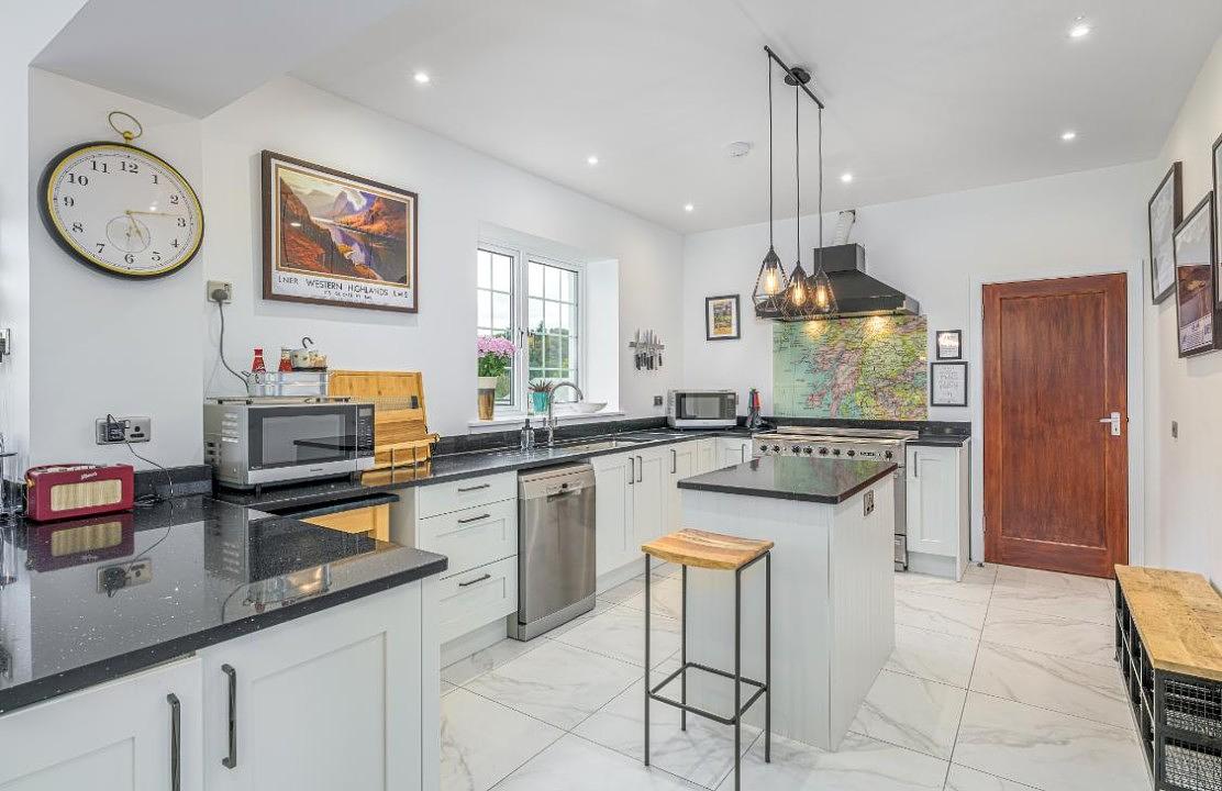 The Kitchen and Dining area at Blà Bheinn is a spacious, thoughtfully designed L-shaped room that combines practicality with sociable charm. It features two distinct kitchen zones: the main kitchen, fully equipped for everything from casual breakfasts to elaborate dinners, and a secondary prep area ideal for making drinks or snacks without interrupting the flow of cooking. Two large islands create a natural gathering point for guests to chat, sip wine, or lend a hand. Well-stocked with ample crockery, glassware, and cookware, the space is perfectly suited for both relaxed meals and festive celebrations.