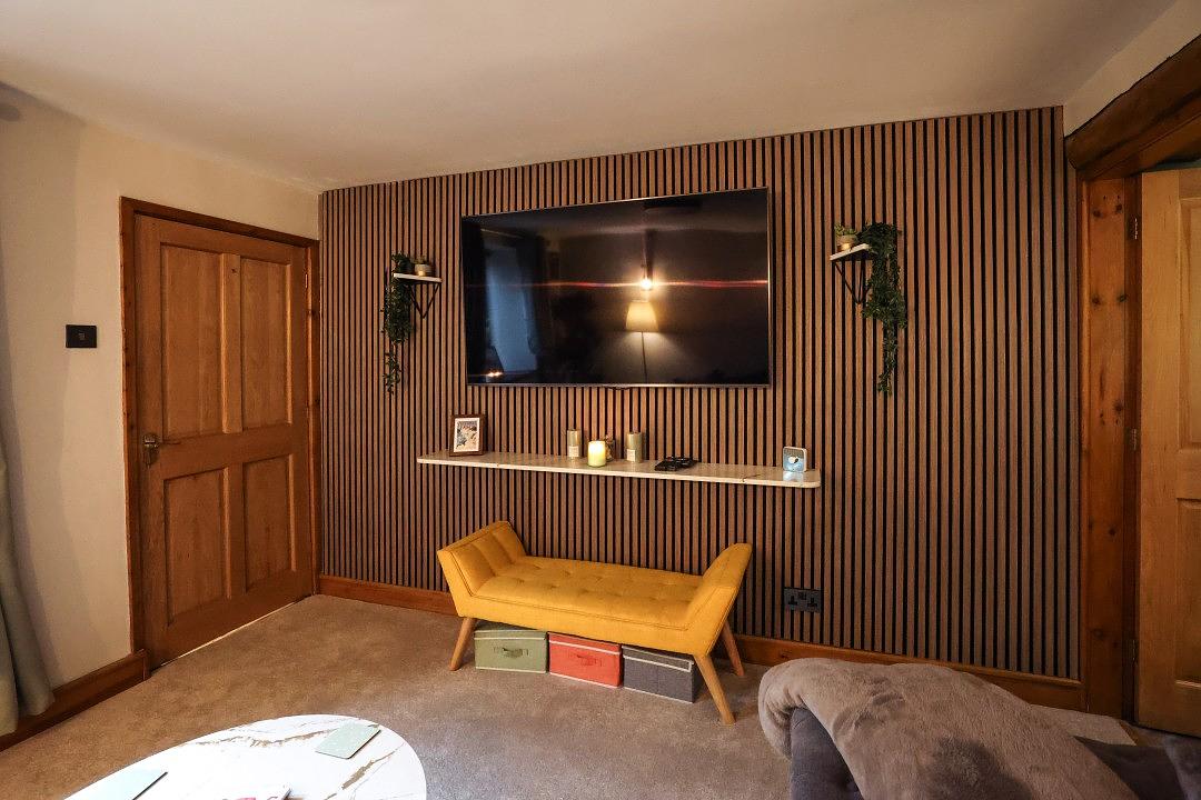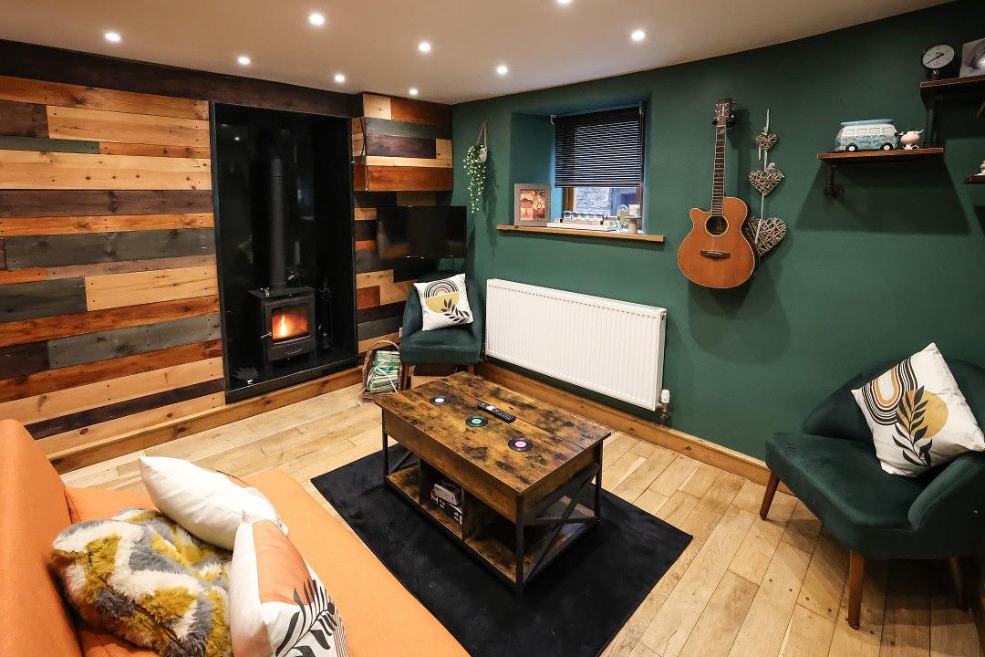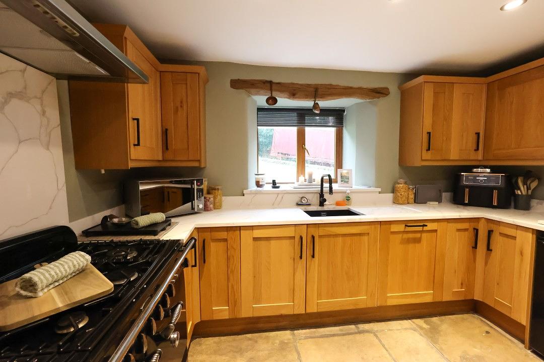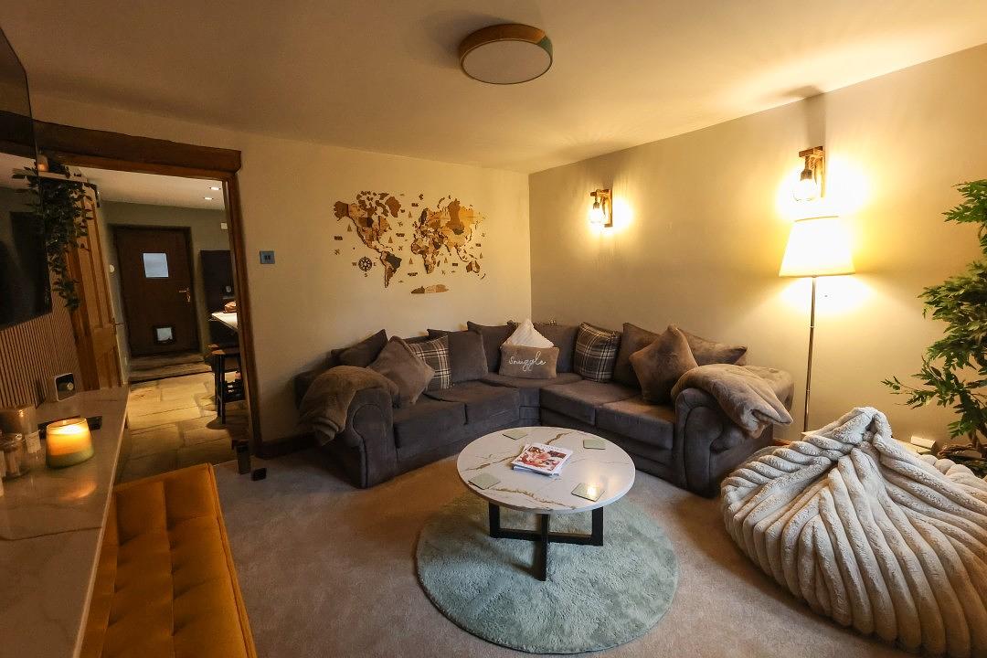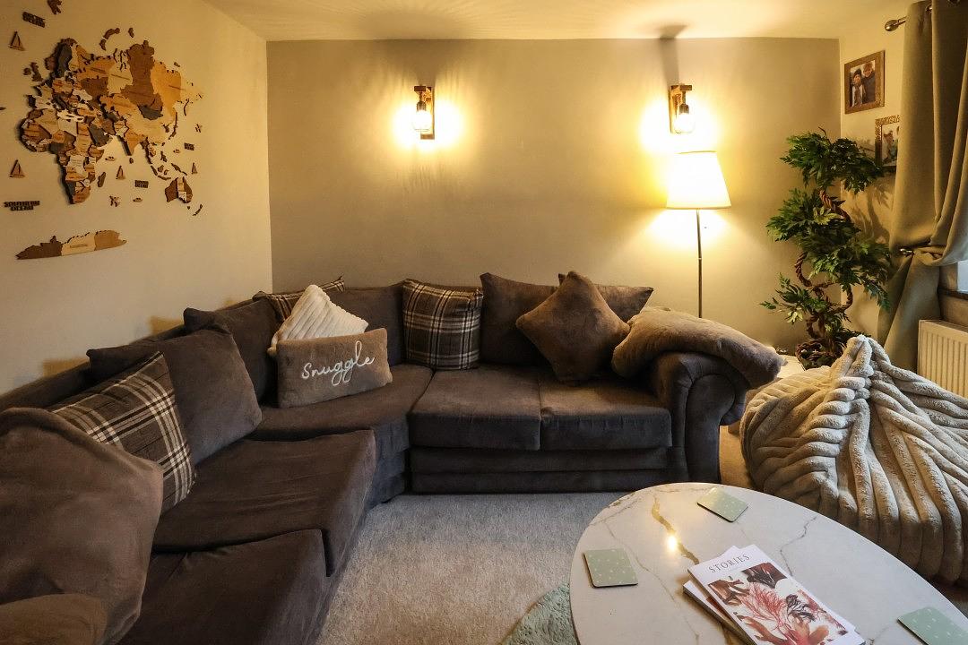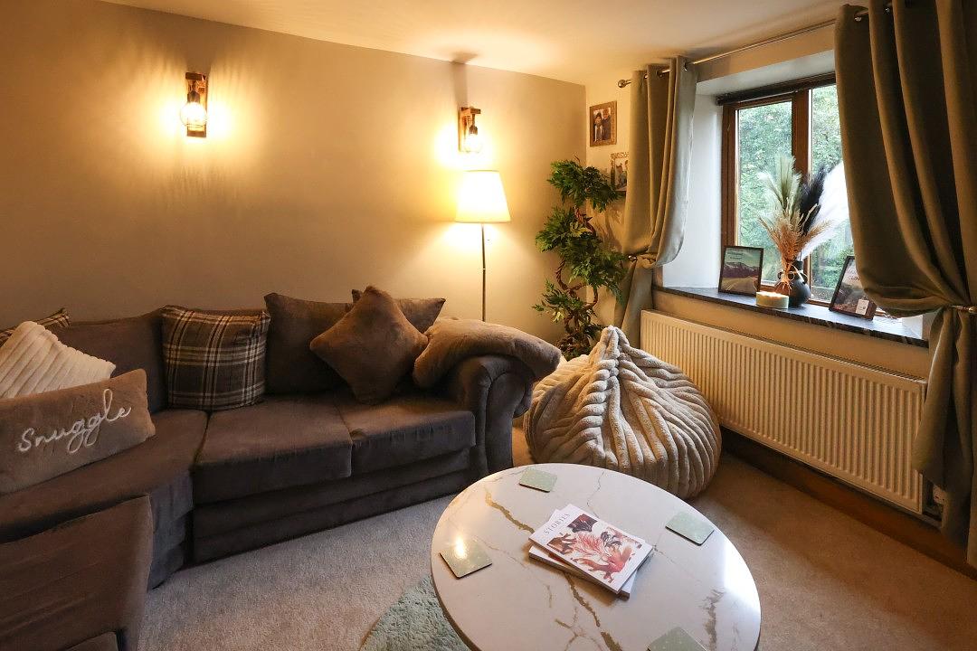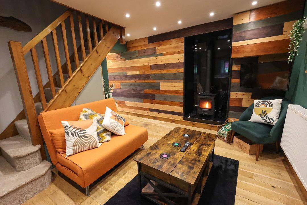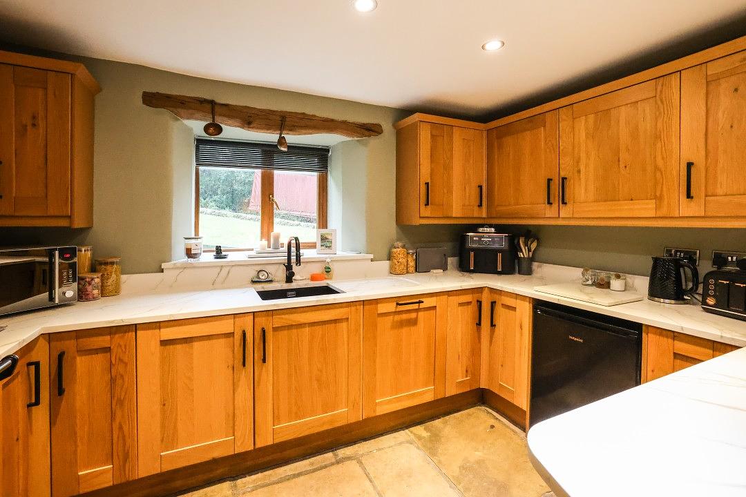 The cottage offers a cosy sitting room, complete with a comfortable corner sofa and a wall-mounted Smart TV for your entertainment. From the window, you can enjoy charming views of the surrounding countryside, creating a peaceful place to relax after a day of exploring. There is also a second lounge area, open plan to the kitchen, featuring a sofa and a welcoming log burner making this space perfect for family and friends to gather.