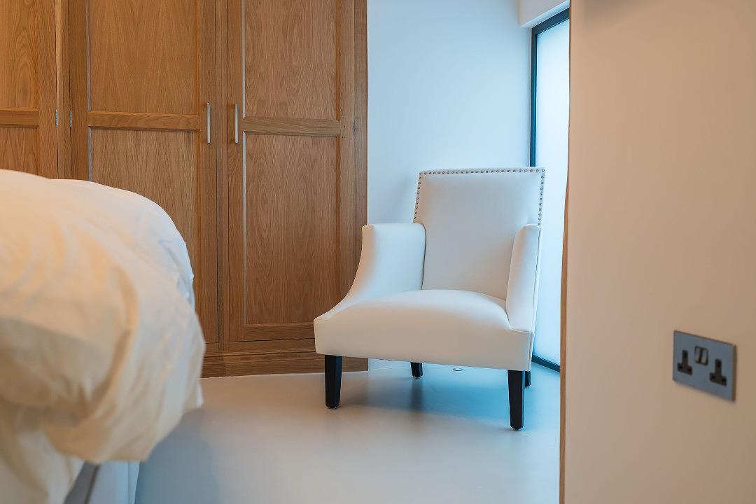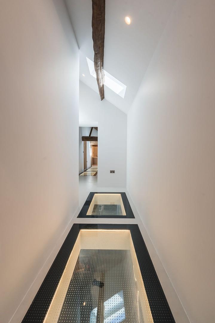 Throughout the property, large windows flood the space with natural light, highlighting the seamless integration of modern elements like the glass log burner set into the lounge wall, and the innovative glass hallway floors that connect the bedrooms. There’s no need for curtains here, either, as natural light is given priority here, with remote controlled frosted windows to ensure privacy.