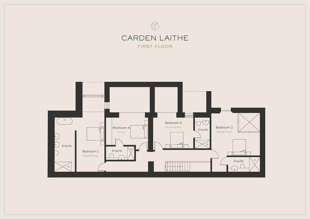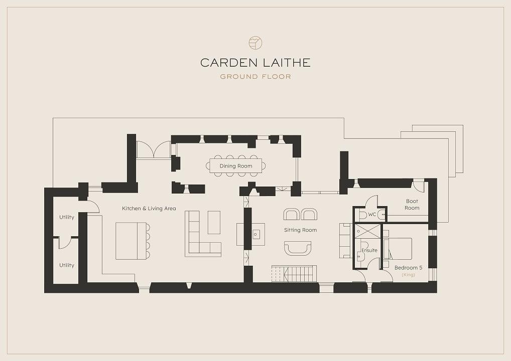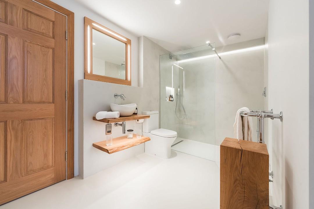 There’s a further lounge area with a large corner sofa, hidden bluetooth speakers and Smart TV as well as a ski-chalet style burner fire. This leads through to the exposed staircase which takes you up to the first floor where there are 4 modern, spacious and light bedrooms with large comfortable beds, and all are ensuite. The fifth bedroom is designed with accessibility in mind, located on the ground floor it is perfect setup for wheel-chair users.