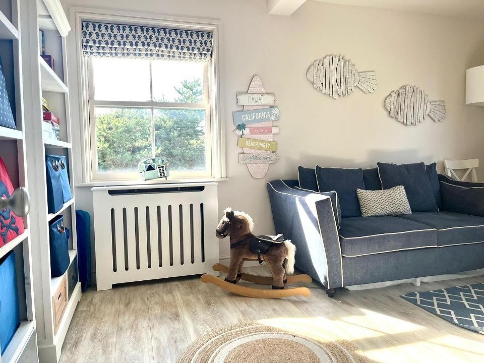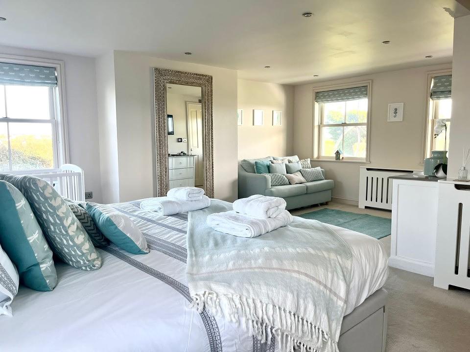 Bedroom 2 - large super king bed (zip and link) with wooden cot, sofa, TV and ensuite with shower