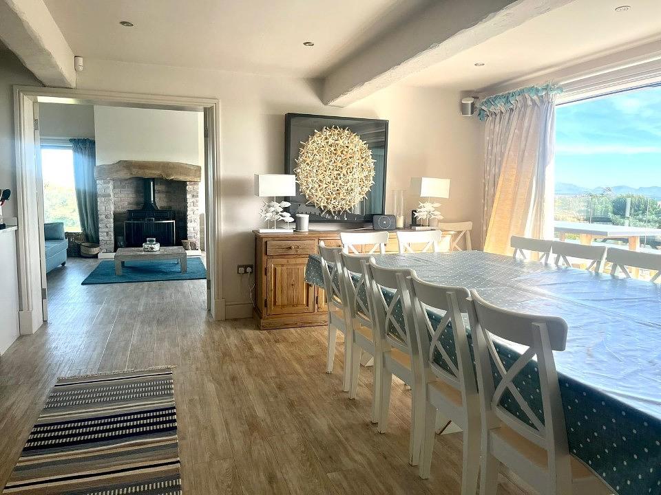 Table for 16 with views over the coast and patio door to balcony area with BBQ and table/benches