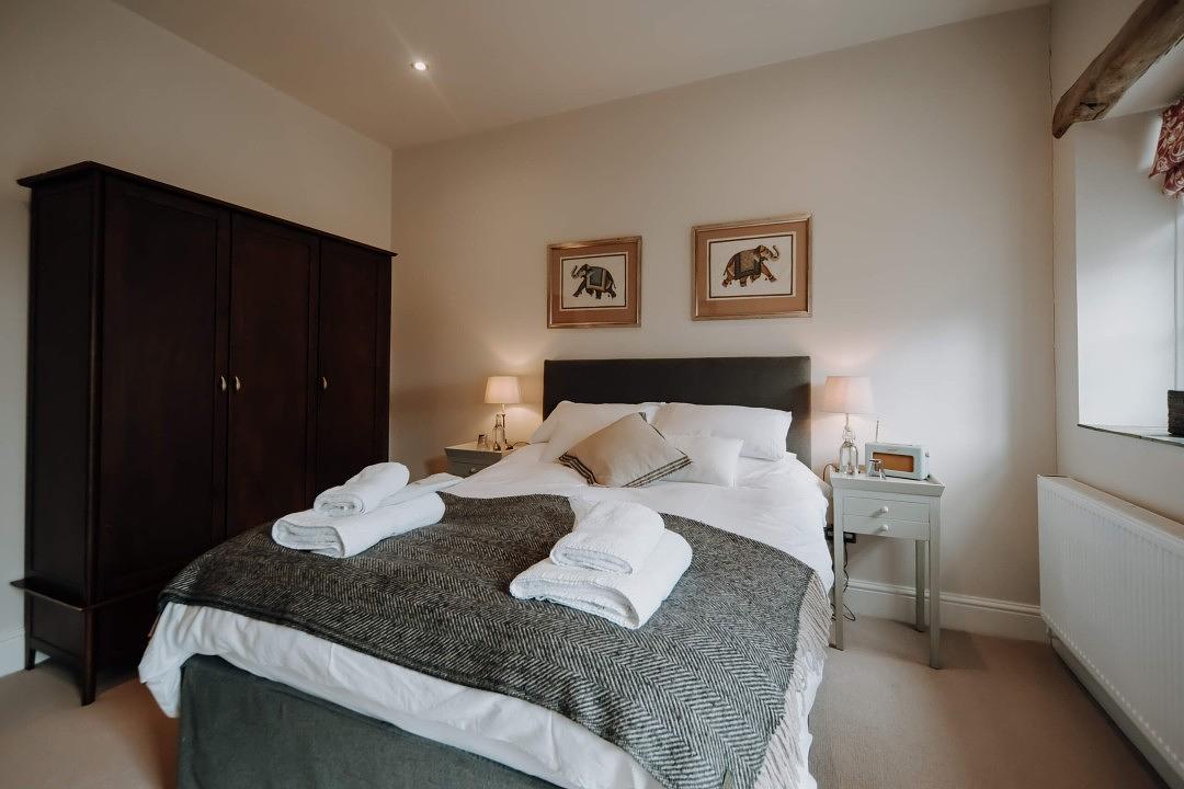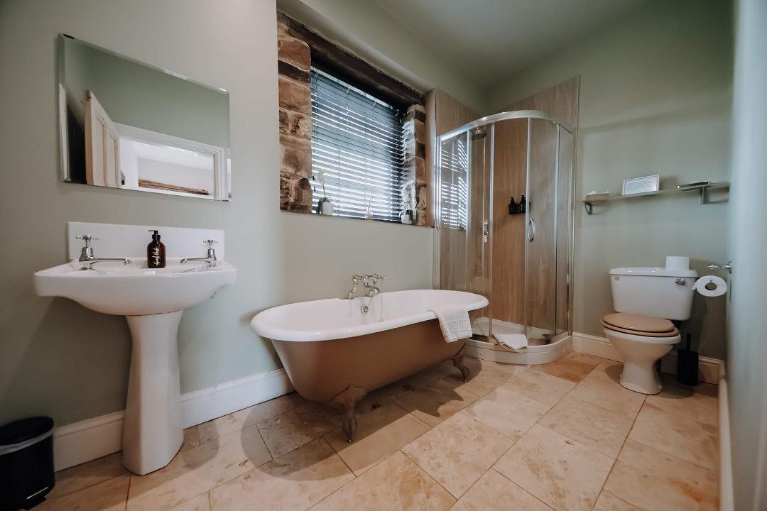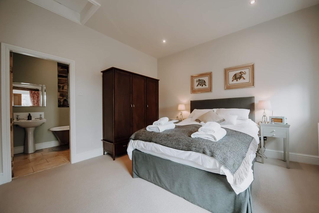 The king-size bedroom at Courtyard Creamery offers a peaceful and luxurious retreat, featuring a plush goose-down duvet, feather pillows, and crisp 100% cotton linen for a perfect night’s sleep. Wake up refreshed and surrounded by countryside tranquillity, there’s no better place to start your day. The ensuite bathroom adds a touch of rustic charm, complete with a freestanding roll-top bath, separate shower, hand basin, and WC, offering both comfort and character in equal measure.