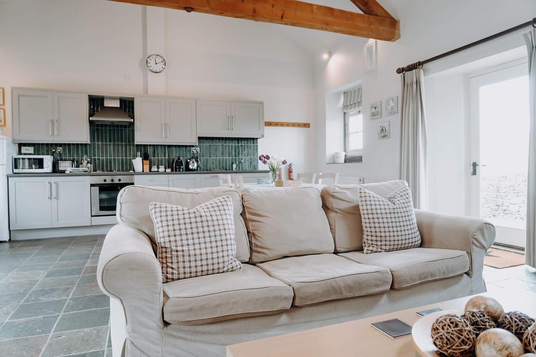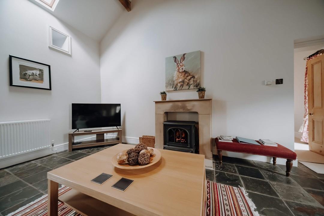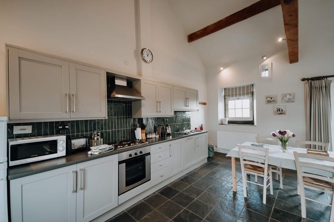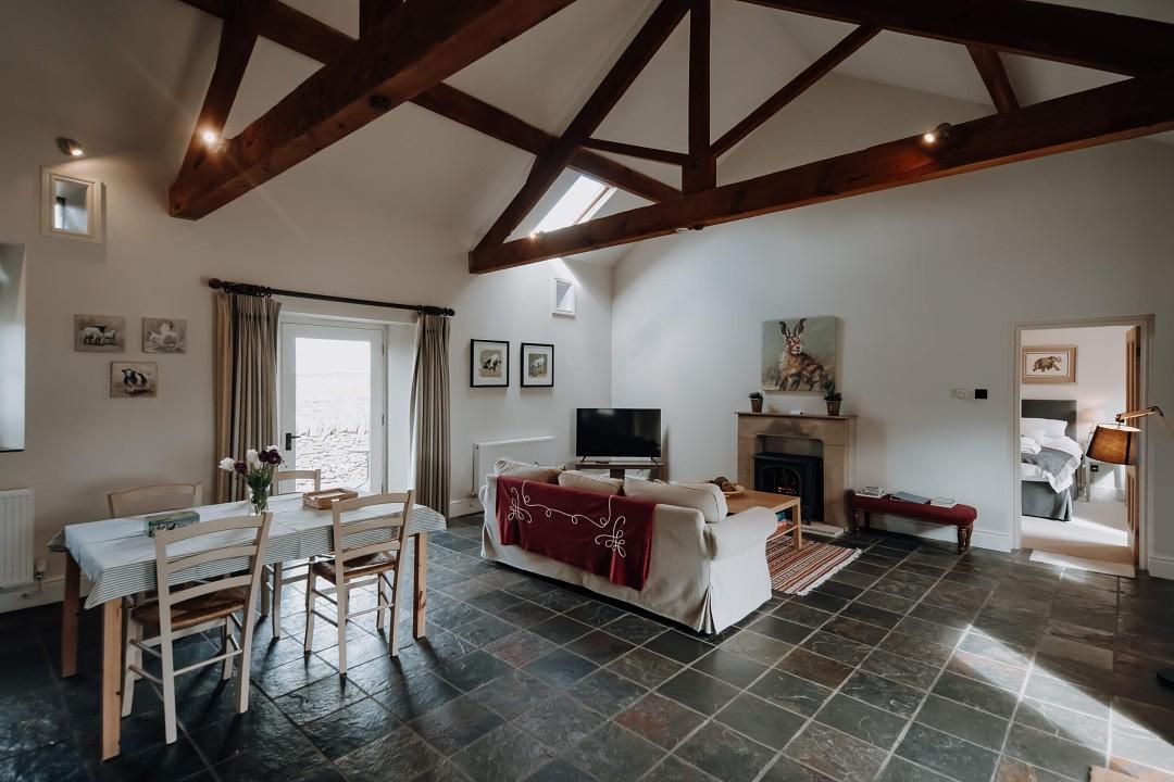 A spacious open-plan living area welcomes you with its high beamed ceiling, blending rustic character with modern comfort. The excellently equipped kitchen makes self-catering a breeze, and there's a dining table perfect for relaxed meals or planning your next adventure. The large, comfortable sofa invites you to unwind by the feature fireplace, while a Smart TV provides entertainment after a day out exploring the Peak District.