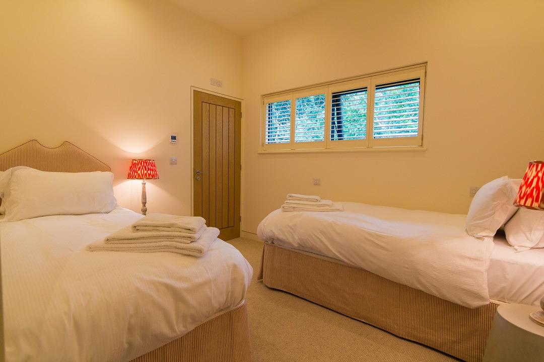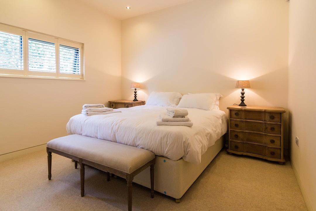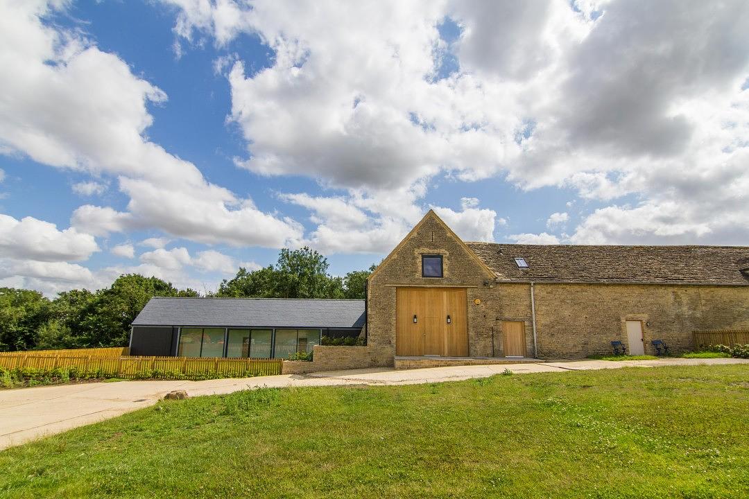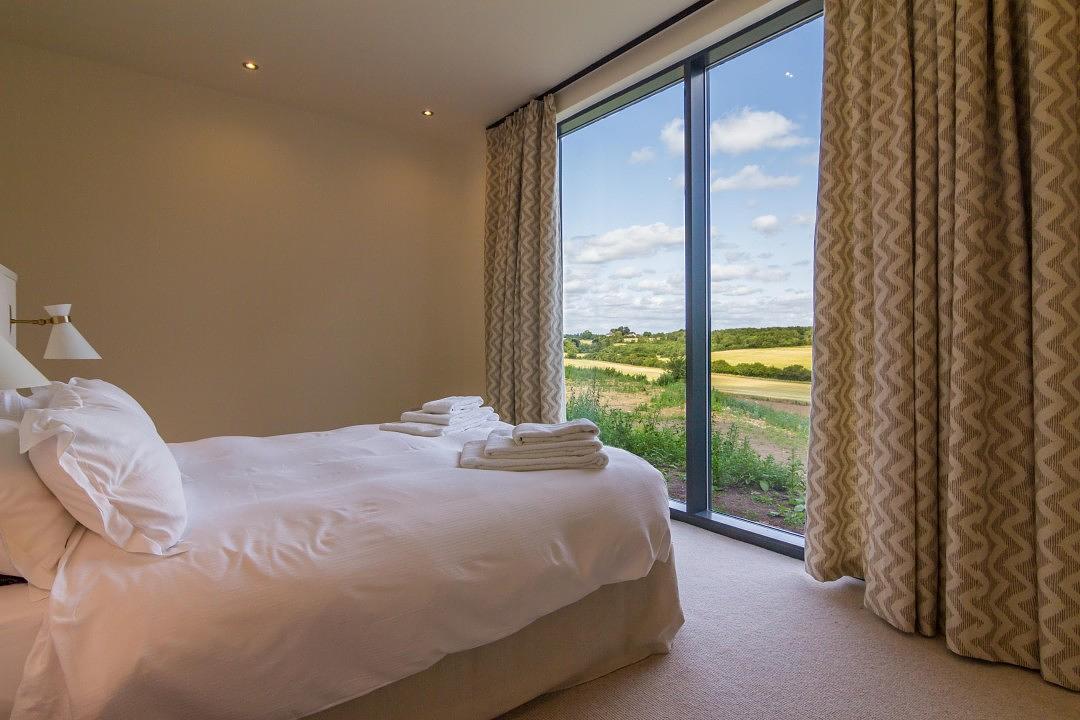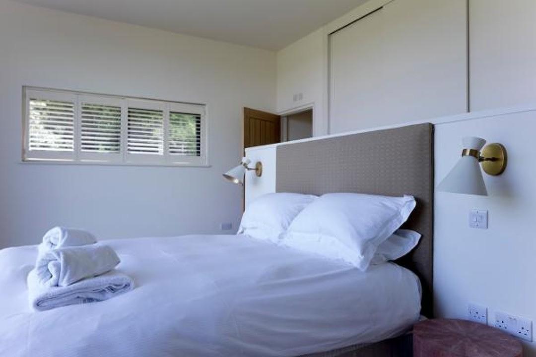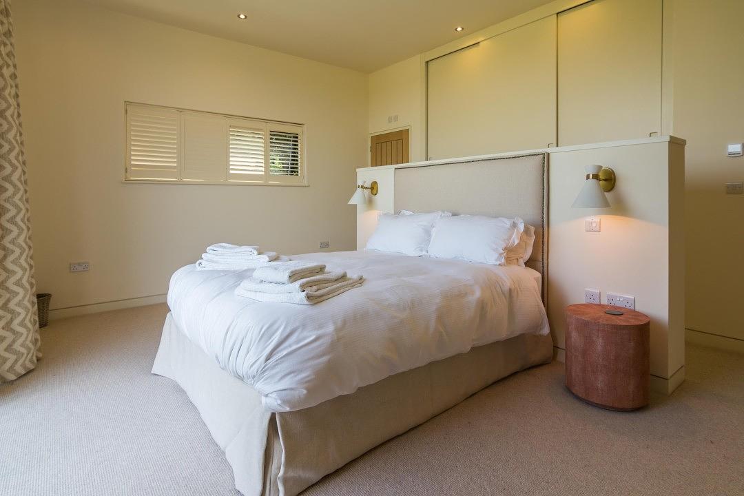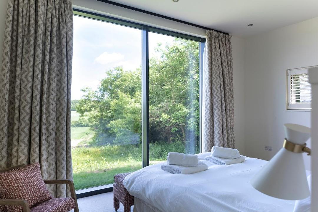 Accessed via a short flight of stairs in the modern wing, the barn includes four spacious bedrooms. These include a luxurious master suite with floor-to-ceiling windows that frame breathtaking views of the surrounding countryside. Each bedroom has been thoughtfully designed for comfort and tranquillity, perfect for winding down after a day exploring the Cotswolds.