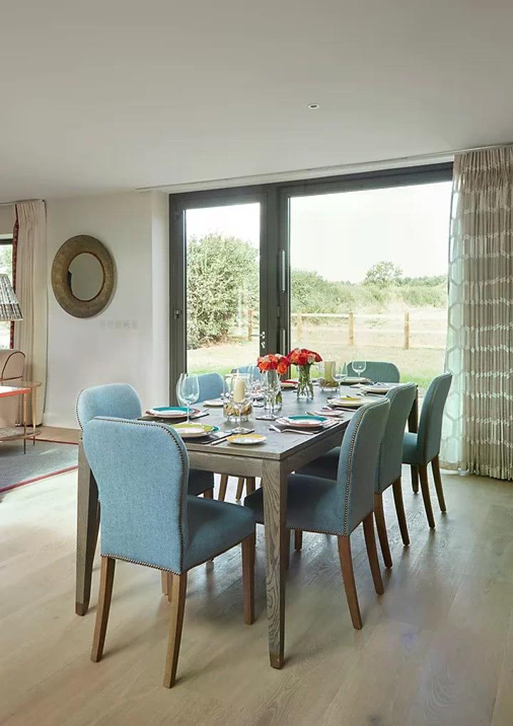 The beautifully designed open-plan living, dining, and kitchen area strikes a perfect balance between spaciousness and comfort. Underfloor heating and a wood-burning stove create a warm, cosy atmosphere, while floor-to-ceiling glass doors flood the space with natural light and offer lovely countryside views. The high-spec kitchen is fully equipped with premium Smeg appliances—ideal for everything from casual breakfasts to home-cooked dinners.