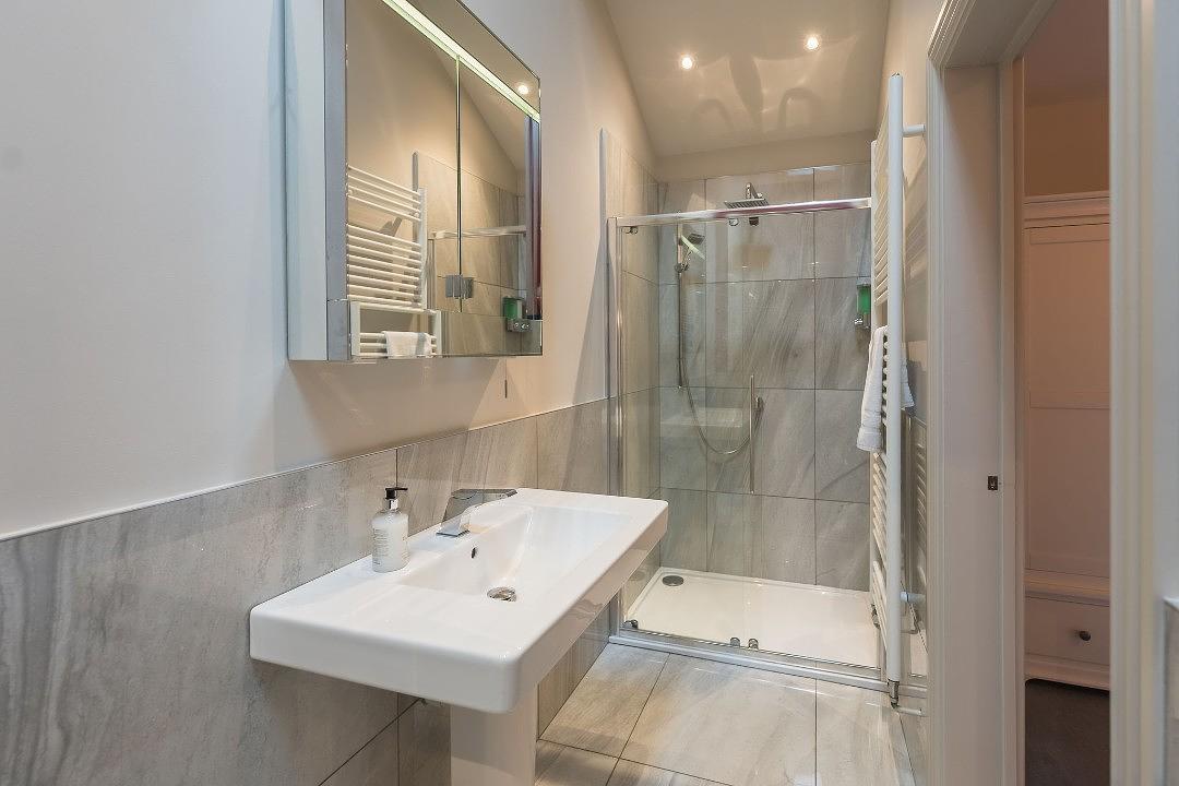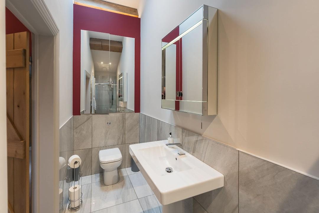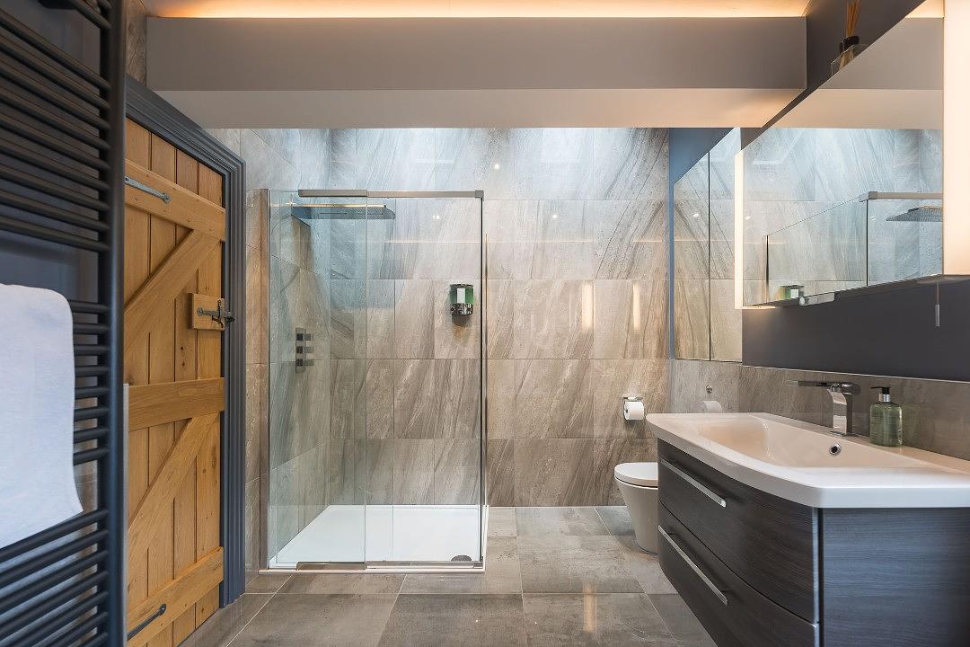 • Bedroom 5 has its own en suite with a walk-in shower equipped with a fixed shower head and a separate attachment, a wash basin, and a WC.