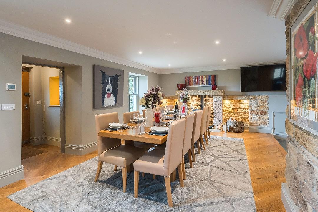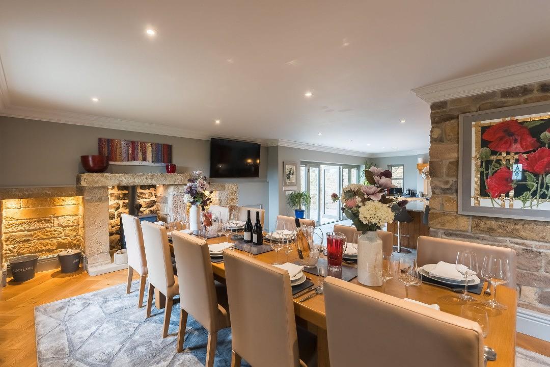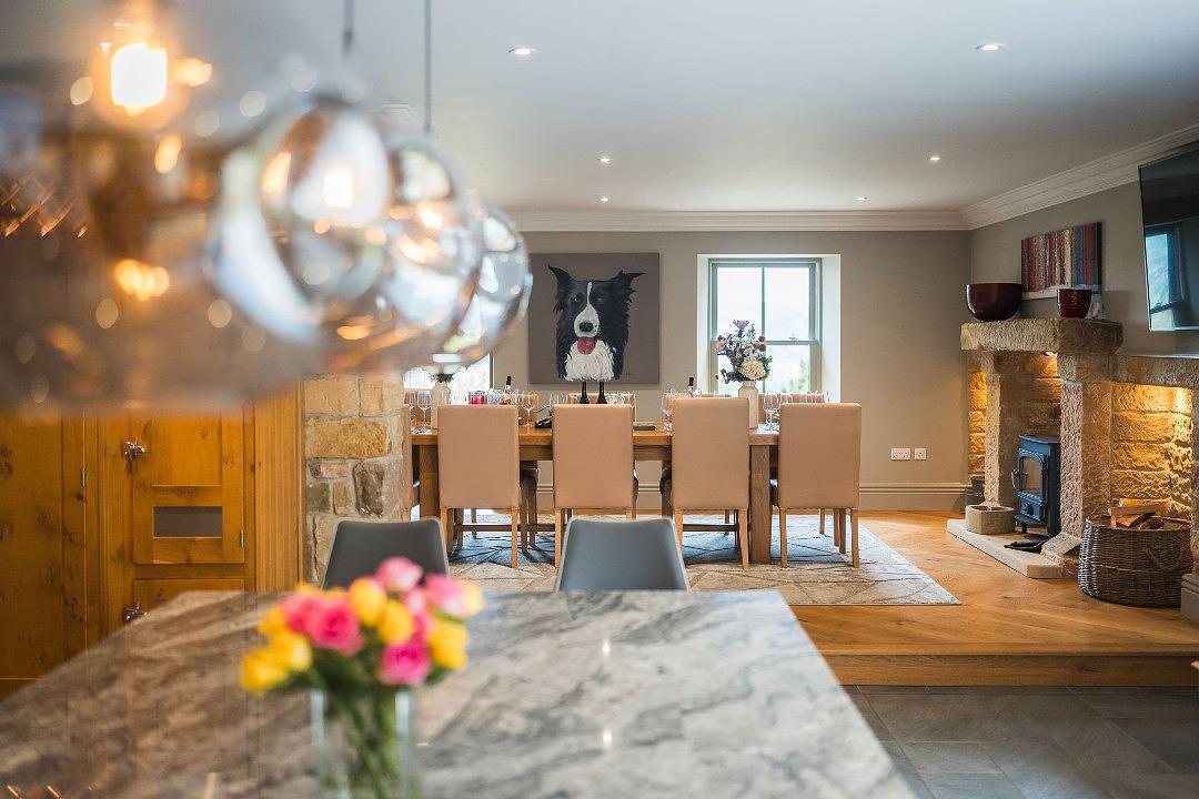 The dining room, located just a step above the kitchen, showcases a remarkable natural stone fireplace that has been carefully restored and refurbished from the original cottage that once stood on the premises. This charming feature adds a cosy and inviting atmosphere to the space, especially when complemented by the warm lighting and the presence of a log burner.