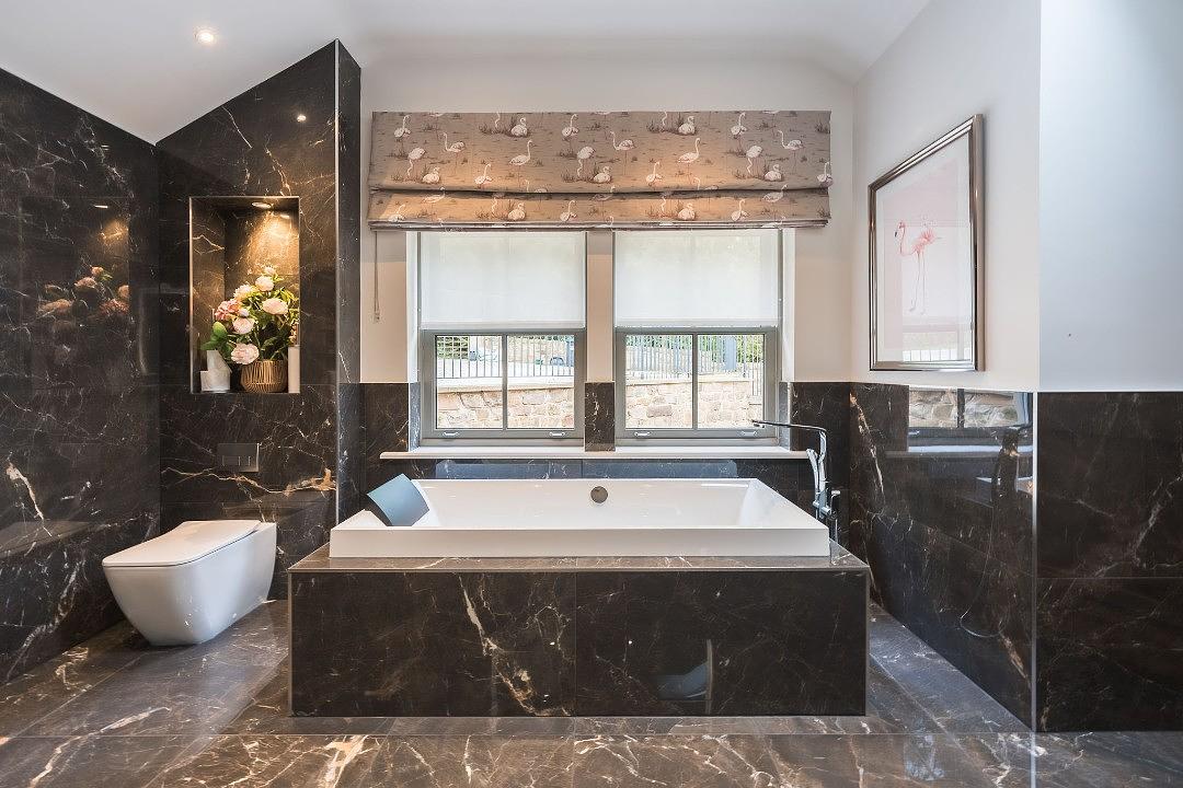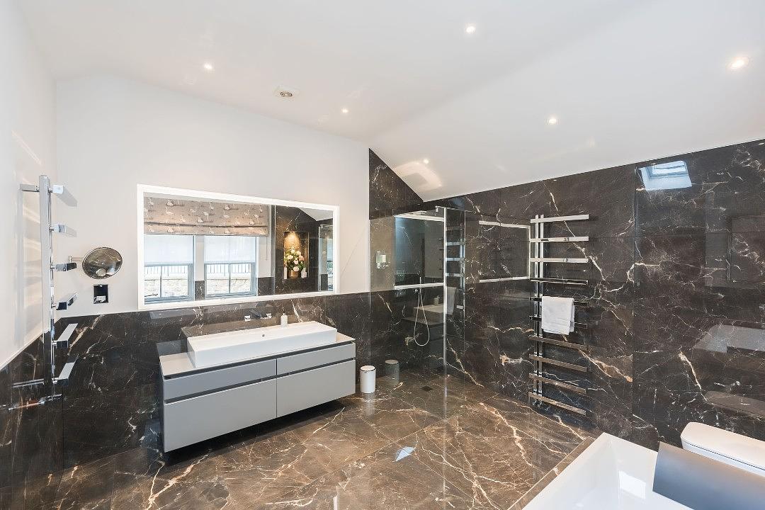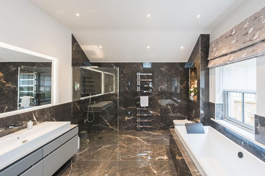 • Bathroom 1 - Luxurious Ensuite in Master Bedroom 1. It boasts a spacious wet room with a Honsgrohe massage shower, a bath with a pull-out shower attachment, a wash basin, and a WC. The room is adorned with stunning marble tiles.