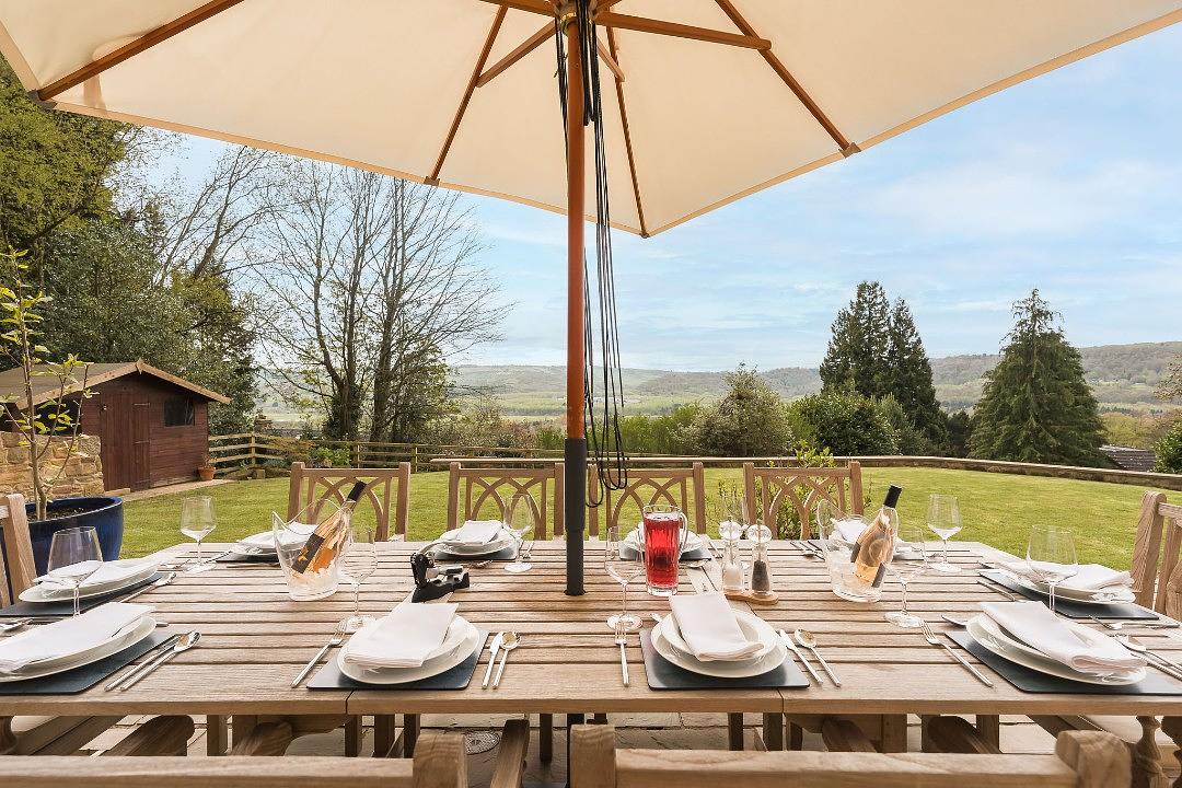 The outdoor space extends to the front of the house, offering stunning panoramic views. A stone patio equipped with a Chiminea, a spacious wooden table, chairs, and a parasol can be found here.