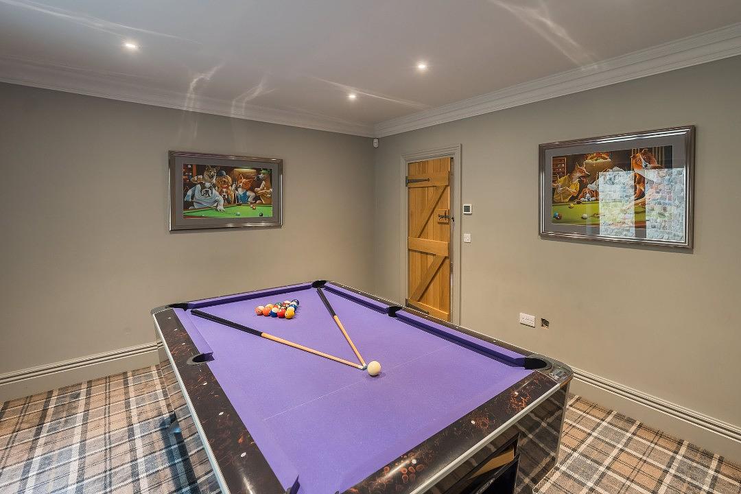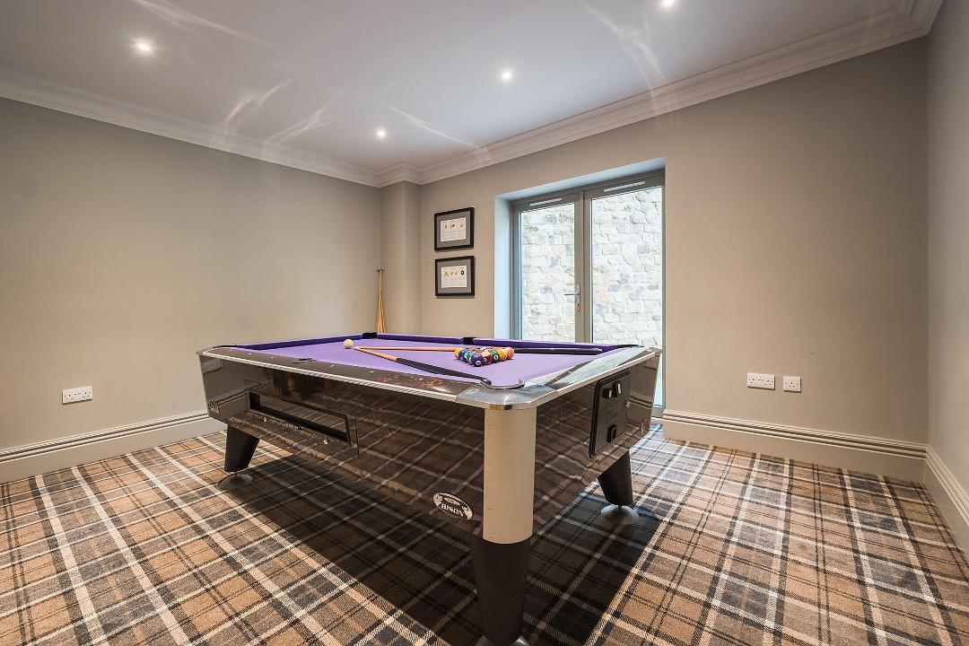 Upon entering the Games Room, guests are welcomed by a stunning lounge area illuminated by the natural light pouring in through the large windows. This space offers a serene setting to admire the picturesque views of the patio, garden, and the expansive valley beyond. The French doors at the front seamlessly connect the indoor and outdoor spaces, allowing for a seamless transition to enjoy the summer sunshine.