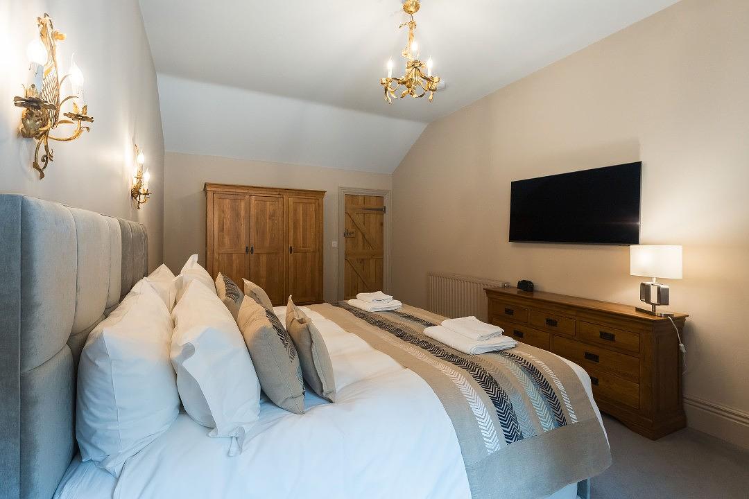 There are five opulent bedrooms, each showcasing its unique style and providing picturesque views of the garden and countryside that envelops the property. Every room is equipped with a television and ample storage space for your personal belongings.
