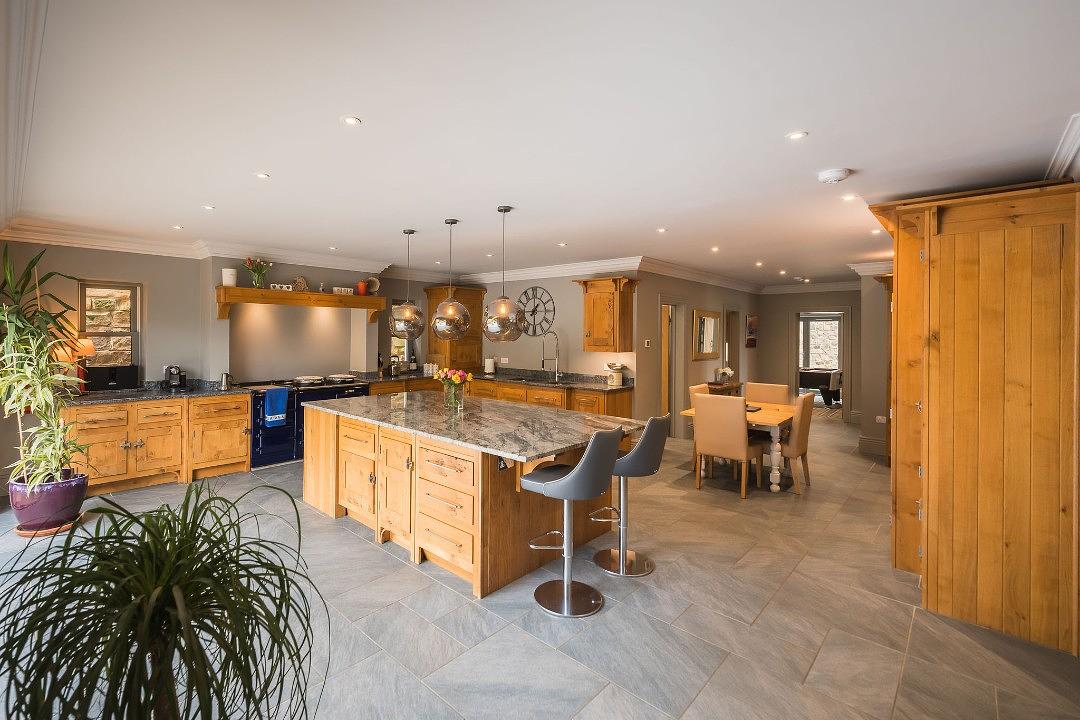 Designer Mark Wilkinson has created a truly remarkable Smallbone kitchen at Darley Dale Cottage, making it the heart of the home. The kitchen is flooded with natural light from the bifold doors, creating a bright and spacious cooking area. With its porcelain tiled floor, underfloor heating, and impressive central island, it provides a welcoming and convivial space for gathering and relaxation.