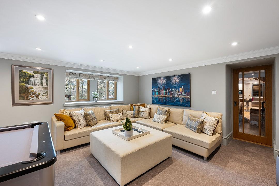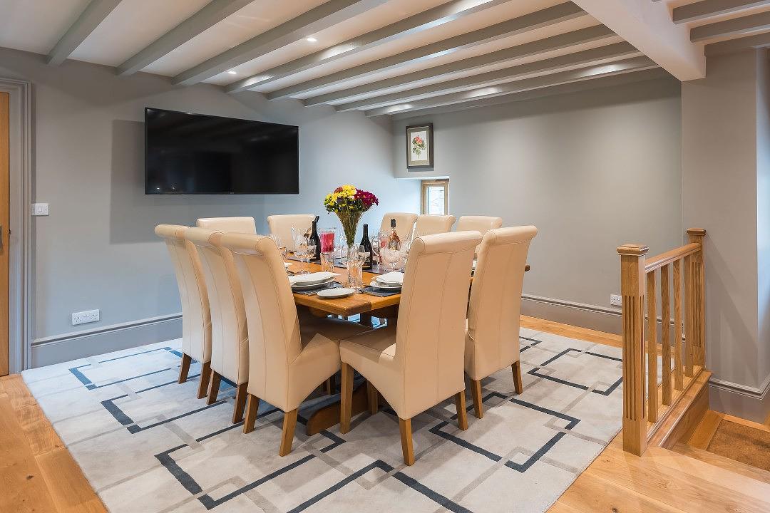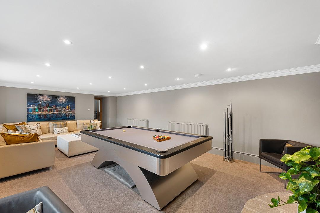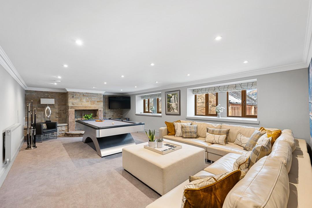 The games lounge, right beside the kitchen diner, is perfect for guests of all ages. Inside, you'll discover the luxurious Olhausen Waterfall pool table, accompanied by cosy seating and a 55-inch flat-screen TV, offering modern comfort and fun for everyone!