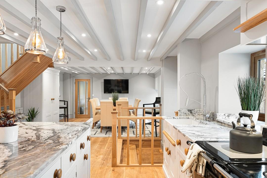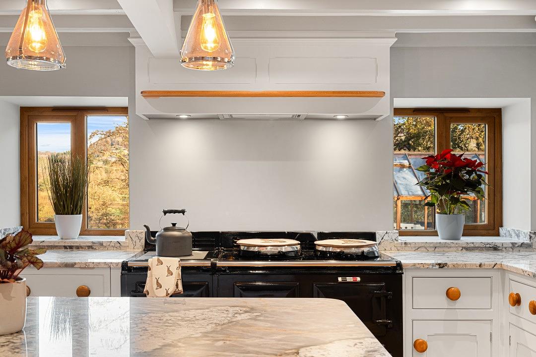 As you step through the traditional farm doors, you're welcomed into the heart of this home, being a spacious kitchen and dining area. It's exquisitely crafted with a bespoke, handmade kitchen by Mark Wilkinson, oak flooring throughout and a striking central island crafted from natural granite. Every detail has been carefully considered, offering a fully equipped space featuring an Aga complete with two cooking and two warming chambers, twin hot plates, and a warming plate. Complementing this is a Miele electric oven and microwave.