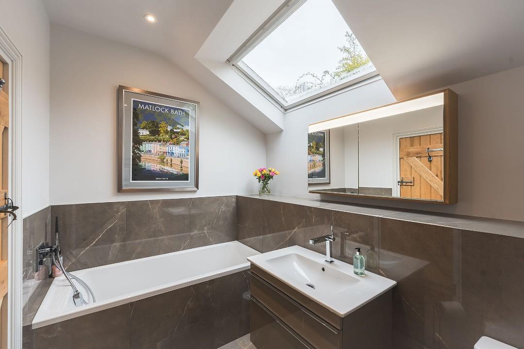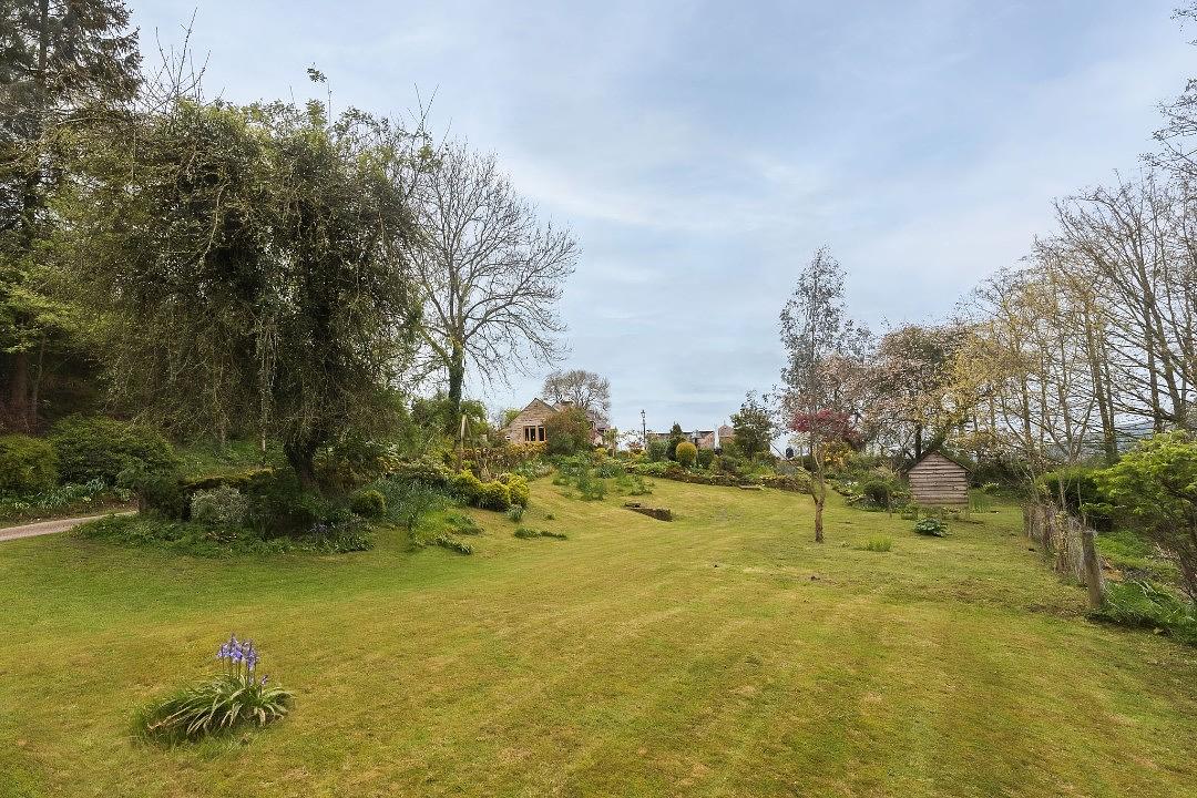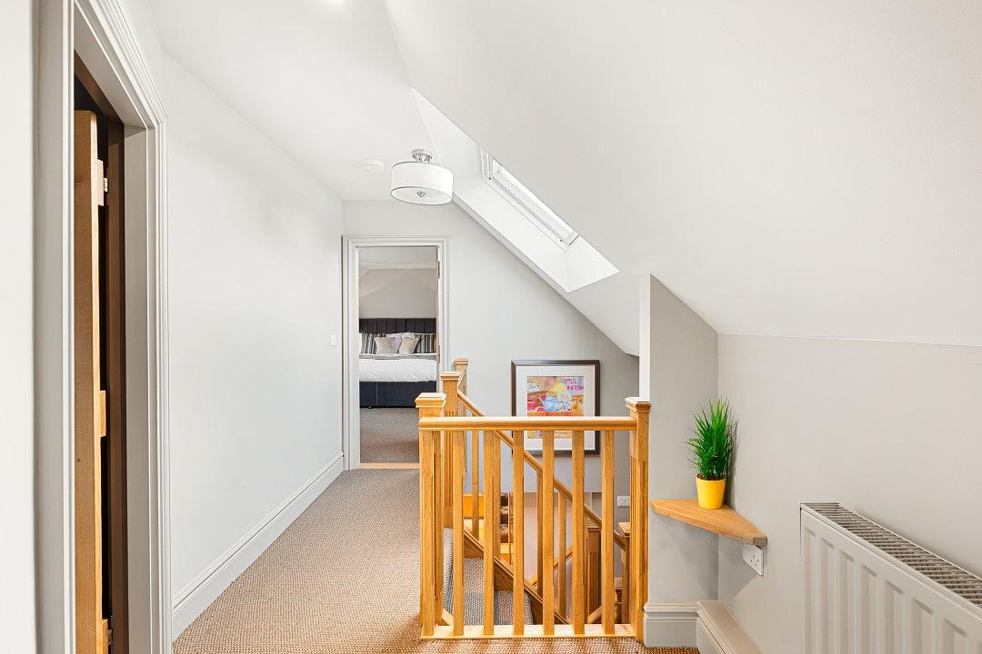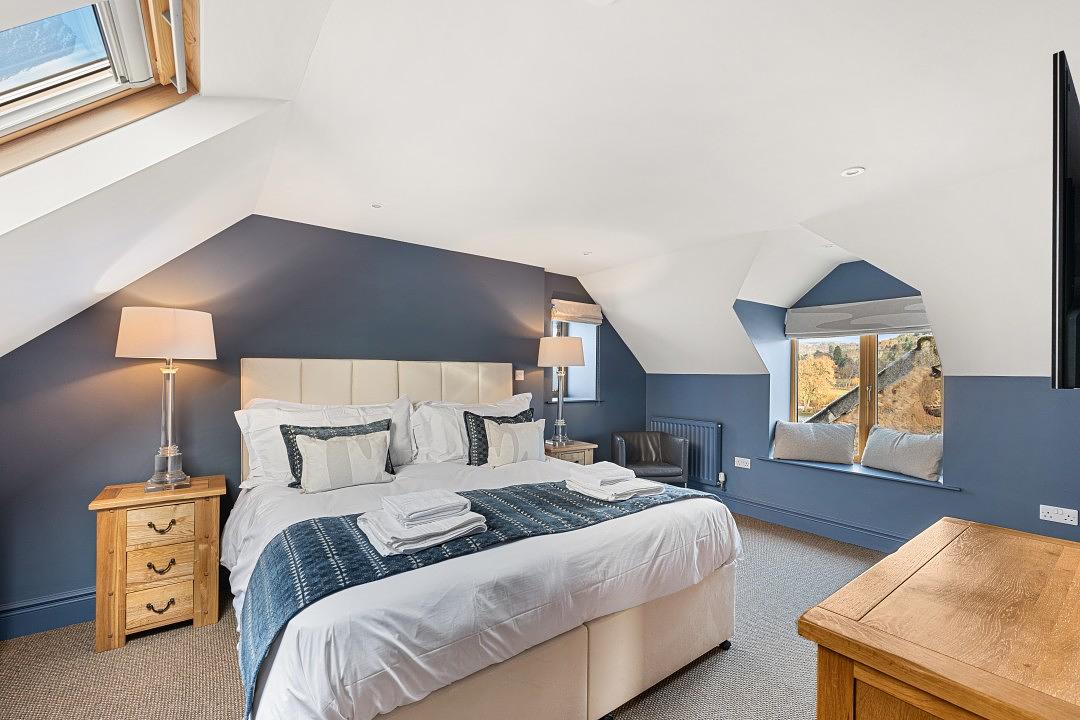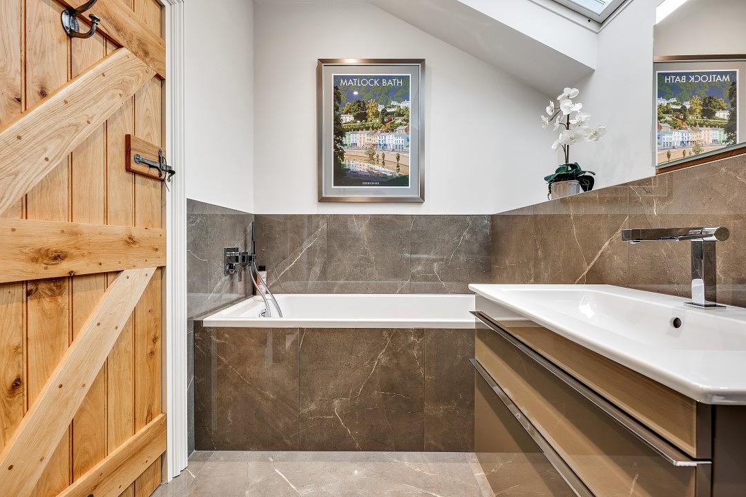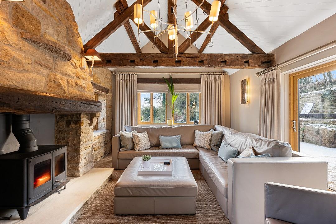 Ascend the steps from the kitchen to discover the snug, a cosy space filled with natural light and captivating views of the garden and countryside through expansive windows and patio doors. A beautiful natural stone fireplace, adorned with a log burner, stands as the focal point, providing warmth and charm during cooler months.