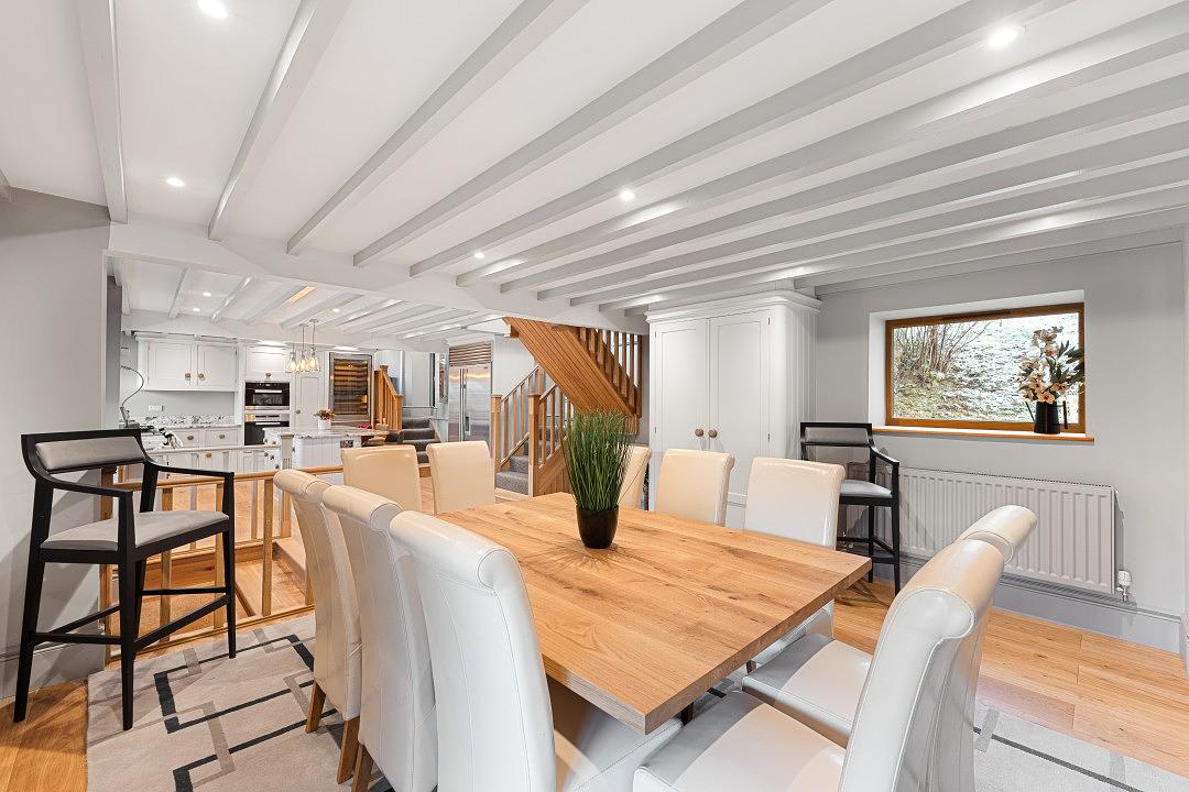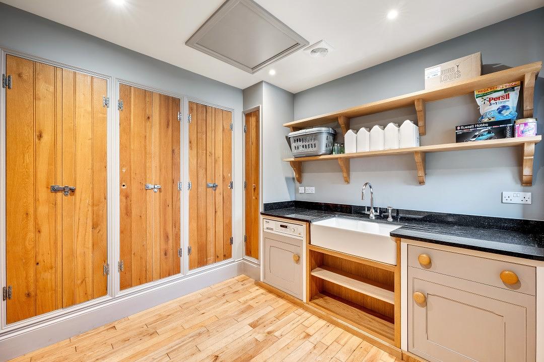 Adjacent to the kitchen, the spacious dining room awaits, furnished with a bespoke oak dining table comfortably seating ten. The large pantry provides lots of storage with shelving and drawers.