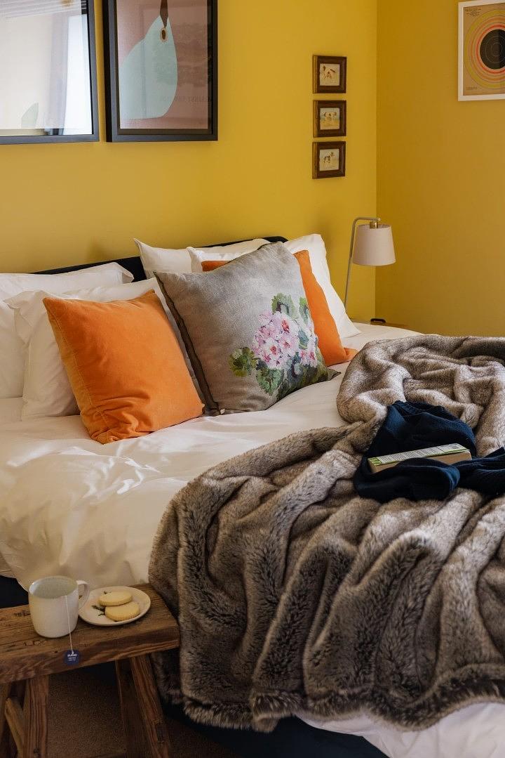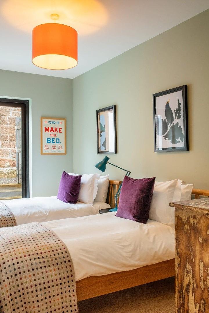 The house centres on a bright, open-plan sitting and dining area with a soaring cathedral ceiling and a vast south-facing picture window framing views of heather-clad hills. Deep sofas, a long farmhouse table, and a wood-burner make it a cosy retreat in any season, while an adjacent accessible bathroom ensures comfort for all guests. Outside, a private stone-walled courtyard invites you to cook on the Big Green Egg and soak in the cedar-clad, wood-fired hot tub under a canopy of stars.