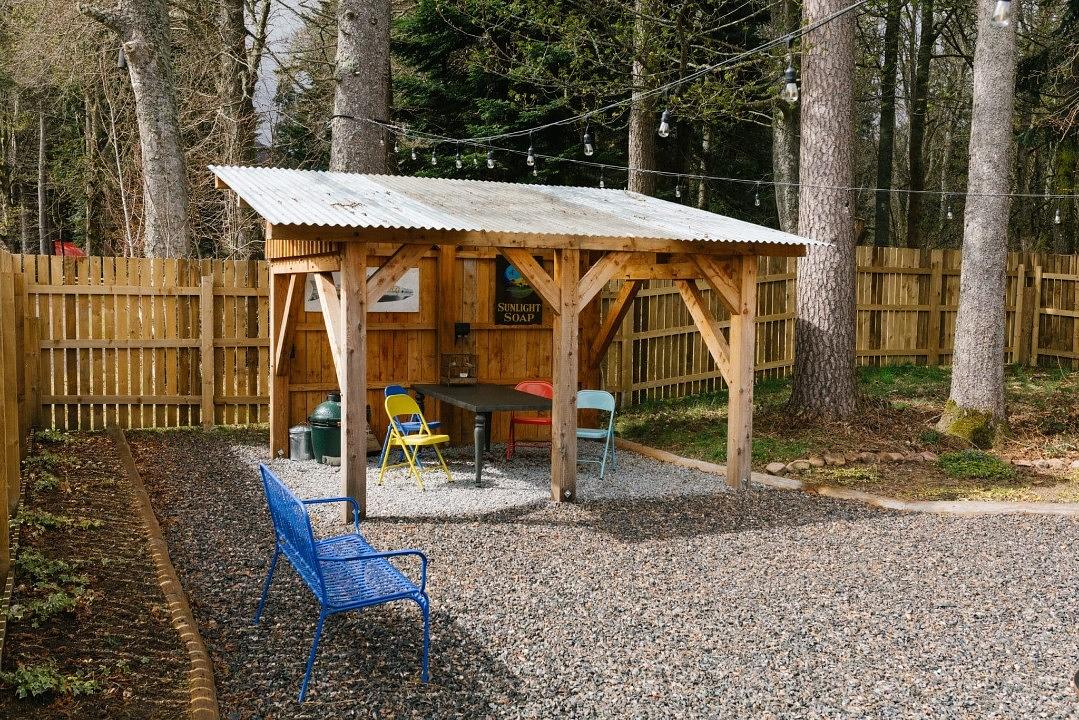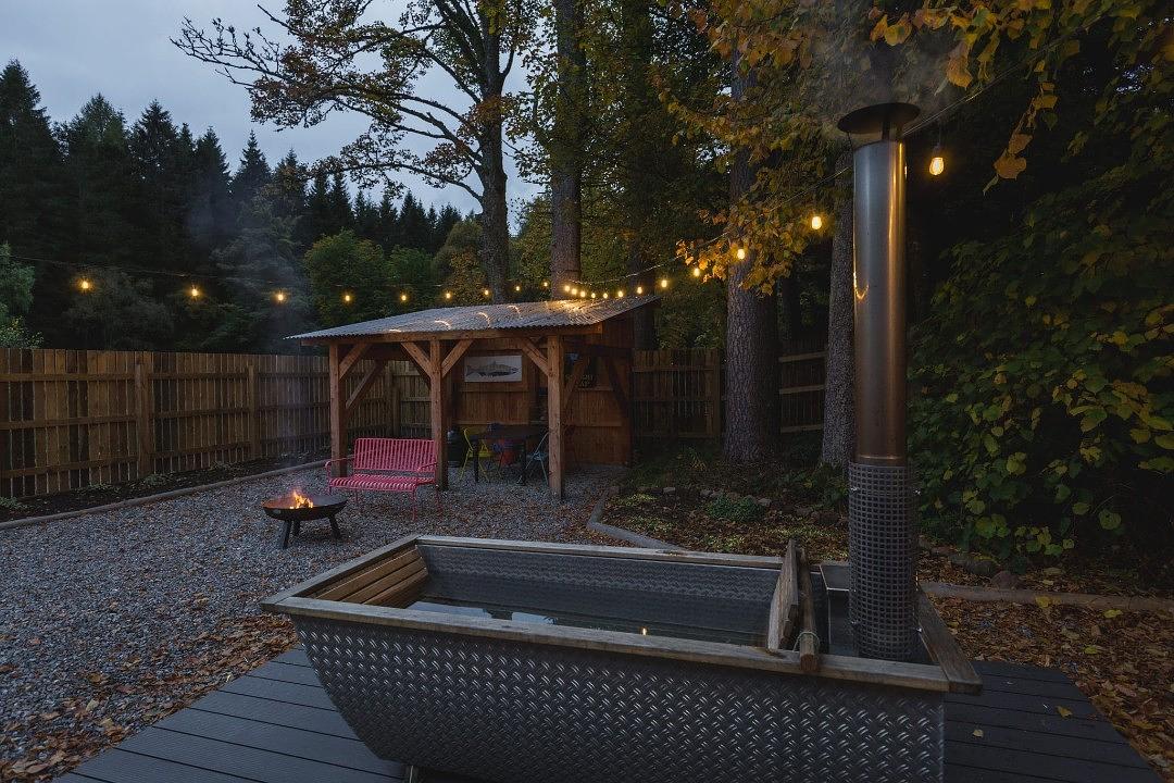 Outside, you'll find a handcrafted outdoor kitchen built using traditional joinery techniques, complete with a Big Green Egg barbecue, and a private Swedish wood-fired hot tub for ultimate relaxation. Guests also have access to the estates own pub with a roaring fire and record player, and Garden Camp-a shared space with outdoor games and a cosy indoor retreat. Seasonal vegetables and fresh eggs are available from our garden, and you can book a session in the riverside electric sauna at the Discovery and Adventure Centre for the full Wild Glen Retreat experience.
