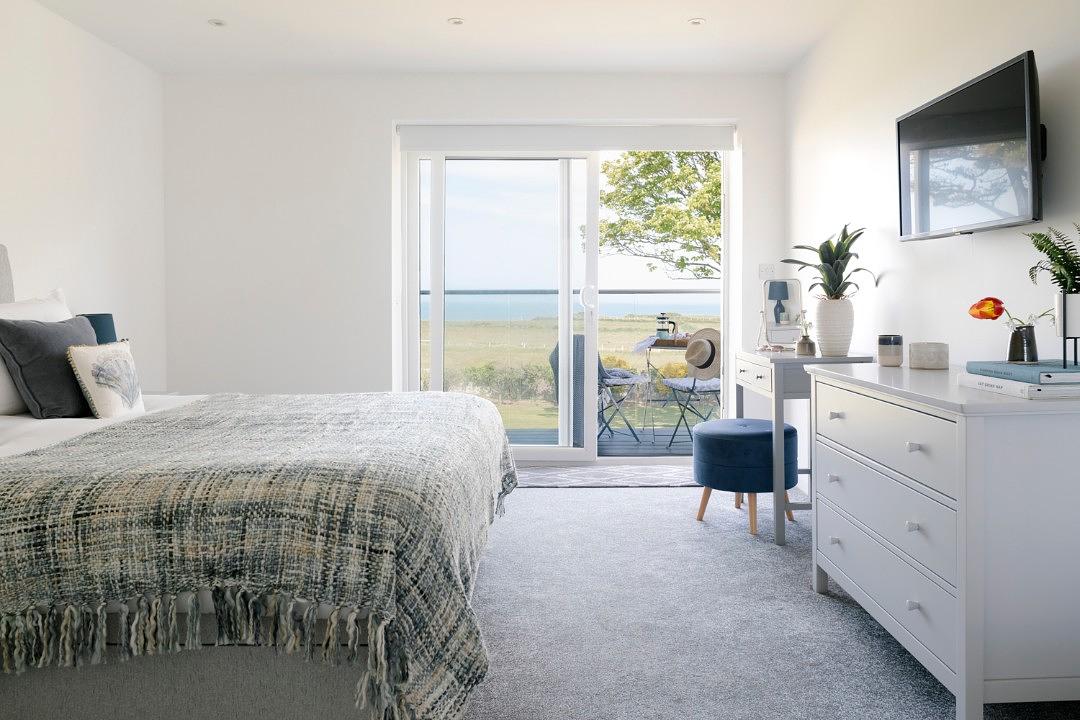 Inside is a property designed with space, light and relaxation in mind. The living area has modern and comfortable furniture within a room that has large french doors that invite in the light and allow guests to enjoy the view.