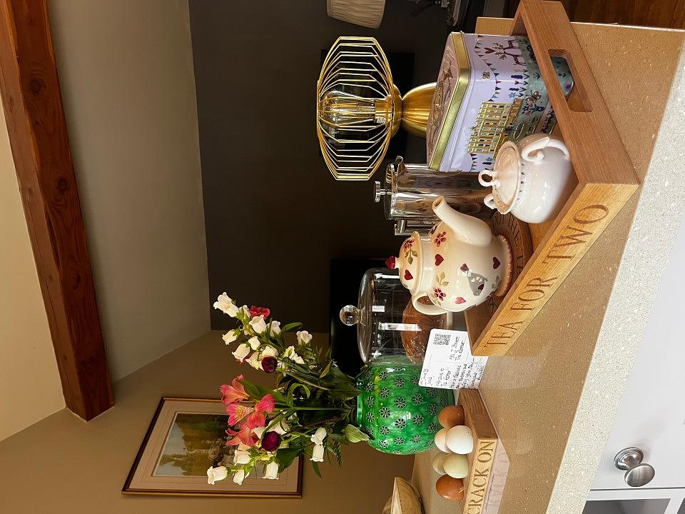 Seamlessly connected to the living area, the fully equipped kitchen is ideal for anything from quick breakfasts to intimate, romantic dinners. Featuring a hob, oven, microwave, and fridge-freezer, it has everything you need for a self-catering stay. Enjoy your meals at the cosy dining table for two, complemented by high-quality utensils and cookware.