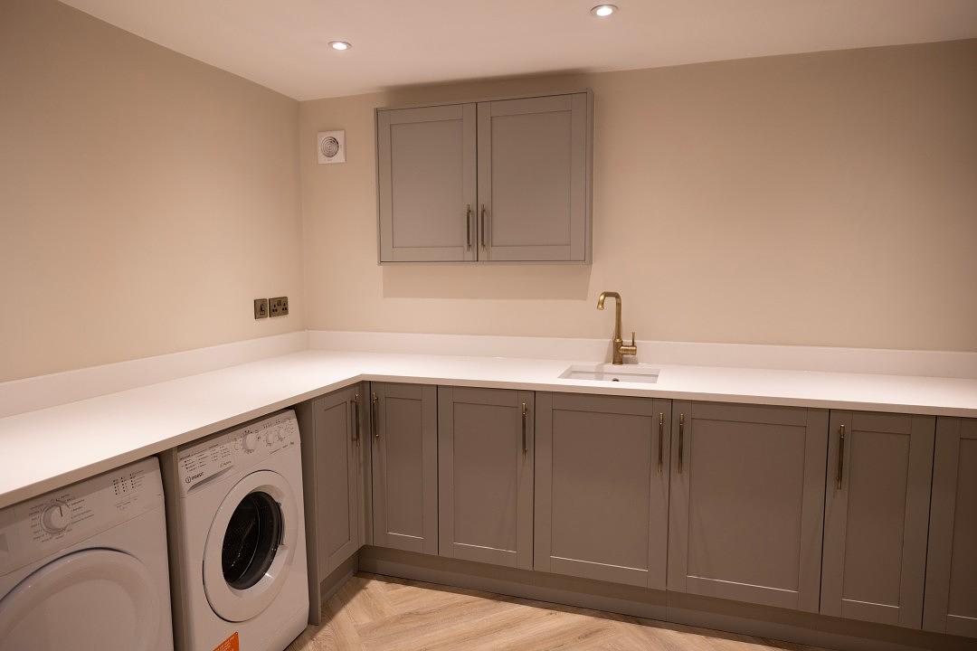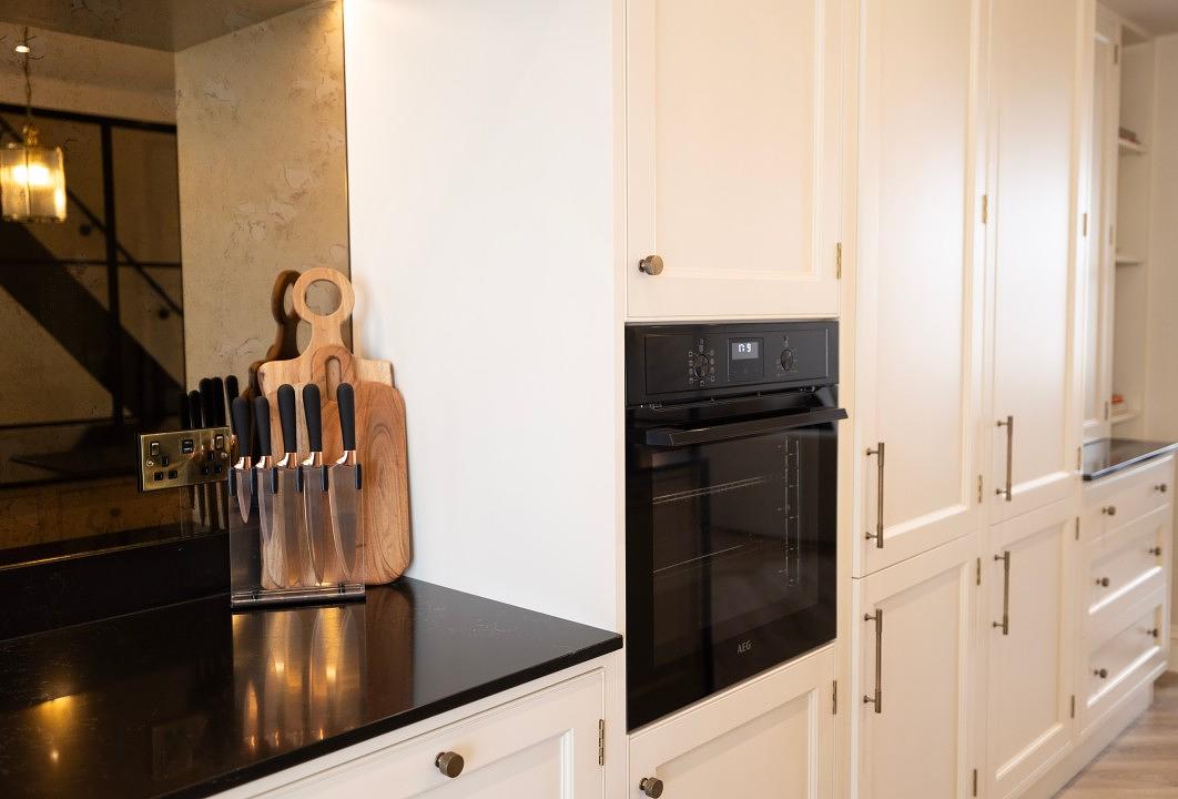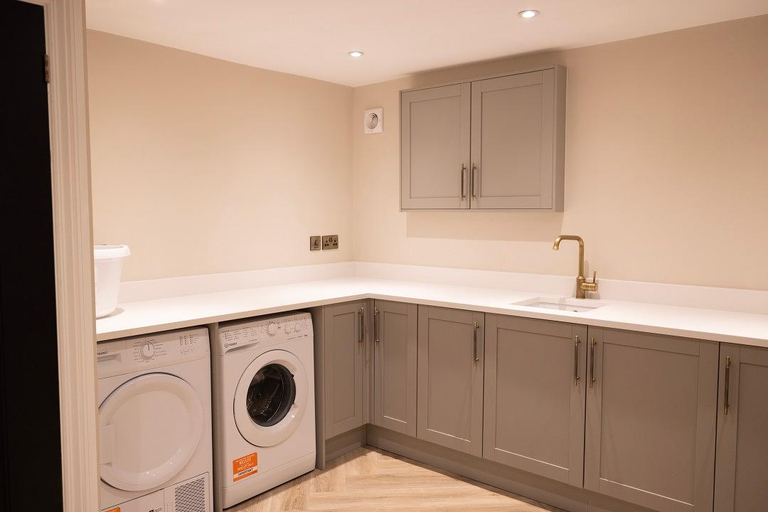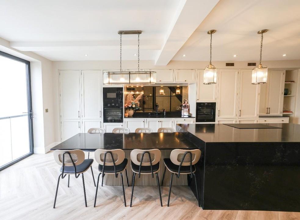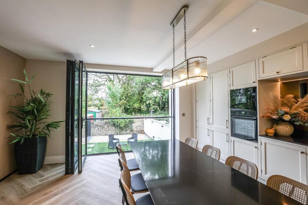 At the heart of the property is the spacious, fully equipped modern kitchen, a true entertainer’s dream. The striking island flows into a bespoke dining table for eight, making it perfect for gathering over leisurely breakfasts or celebratory dinners with bifold doors to bring the outside in on a warmer day. The utility room with washing machine and dryer adds extra convenience for longer stays.