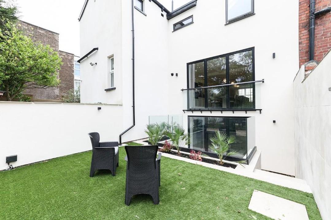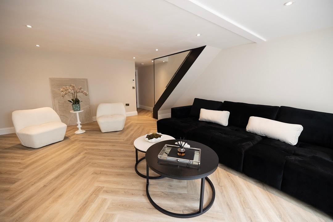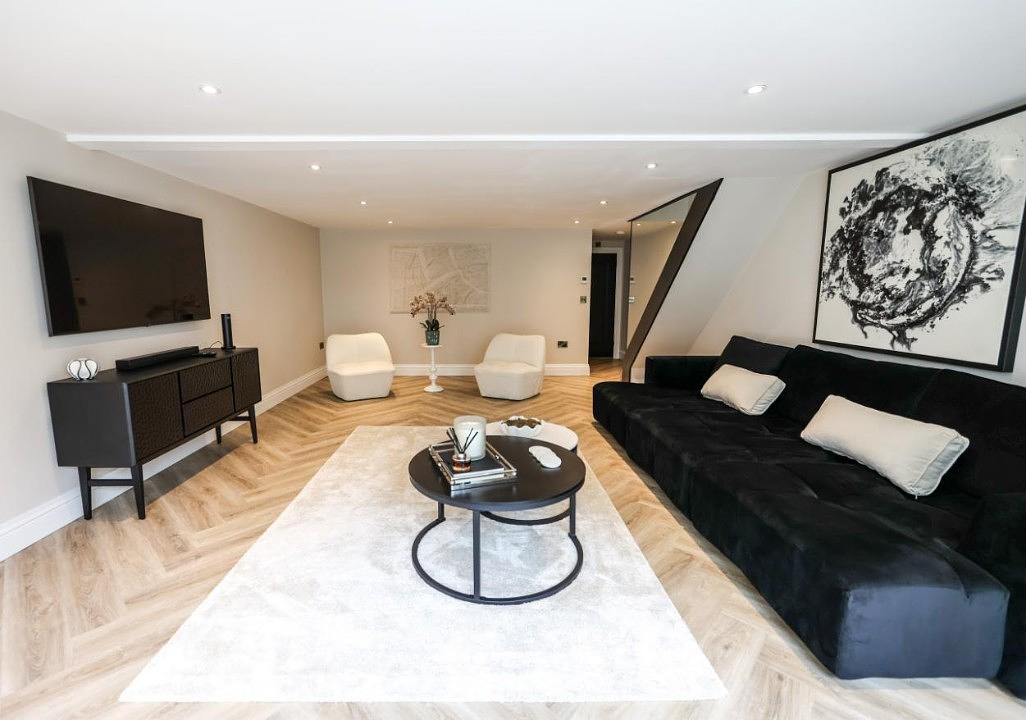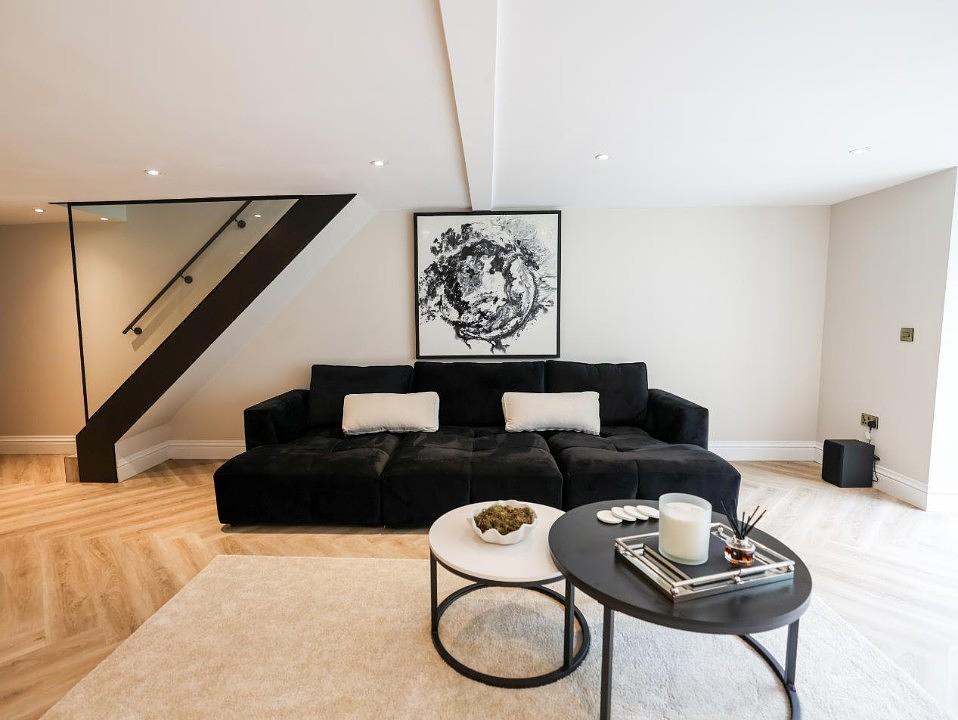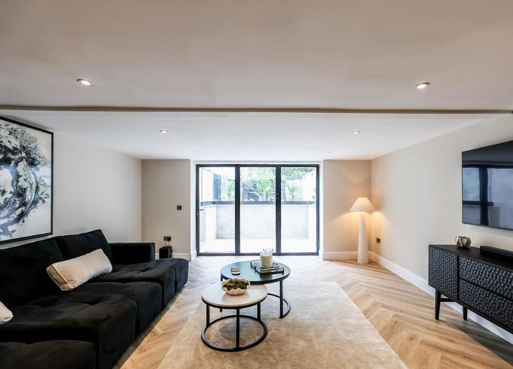 Through stylish glass doors, you’ll find a cosy lounge with ample seating, a large smart TV, and warm natural light, ideal for unwinding after a day of exploring. The lower ground floor offers a second living space with deep sofa and large TV, with bifold doors that open onto the garden.