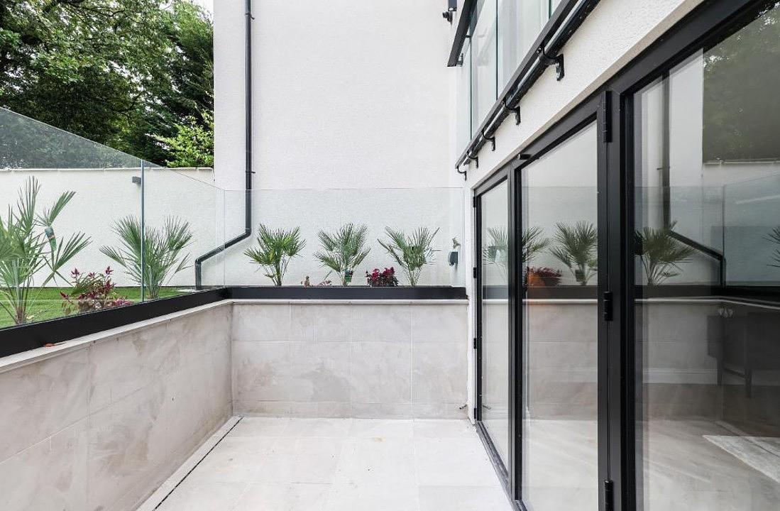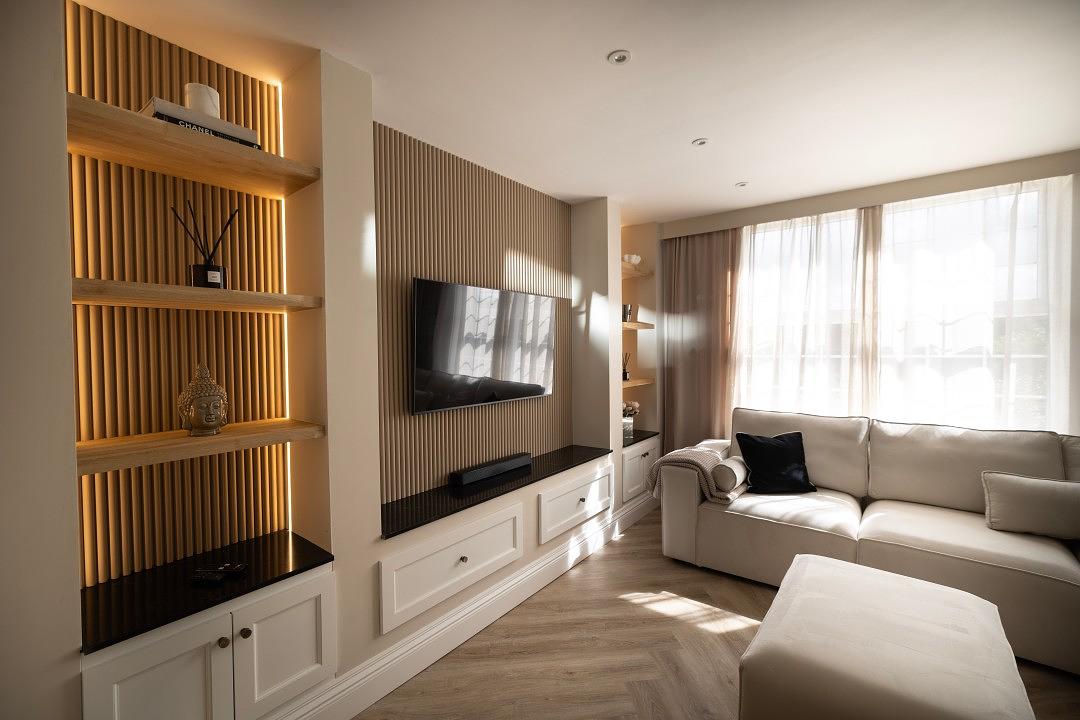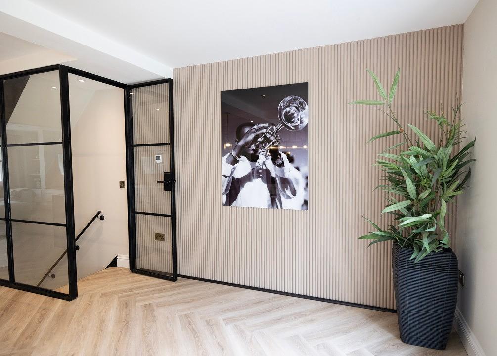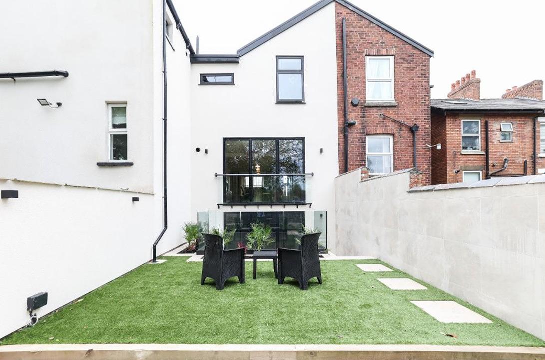 Through stylish glass doors, you’ll find a cosy lounge with ample seating, a large smart TV, and warm natural light, ideal for unwinding after a day of exploring. The lower ground floor offers a second living space with deep sofa and large TV, with bifold doors that open onto the garden.