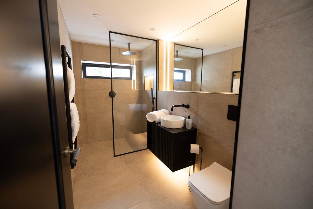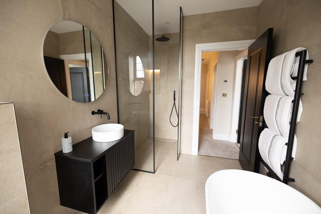 Upstairs, there are four king-size bedrooms, each thoughtfully designed for comfort. One boasts a private ensuite shower room, while another offers the flexibility to be arranged as a twin room. The family bathroom feels like a boutique spa, with a walk-in shower, a deep stand-alone bath, and high-quality fixtures. Crisp white bed linens ensure a restful night’s sleep for all guests. There is an additional shower room on the lower level floor.