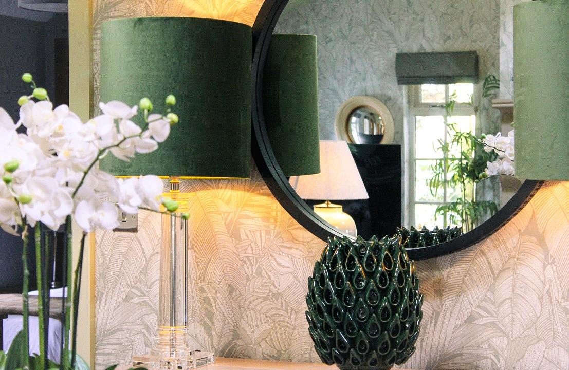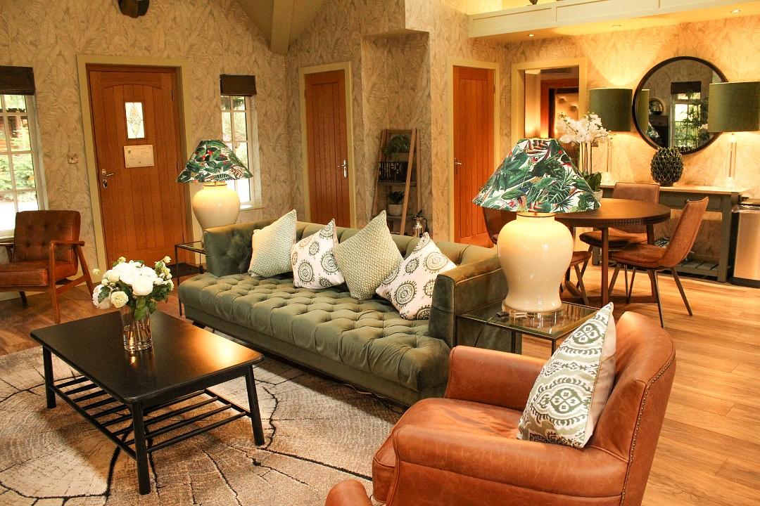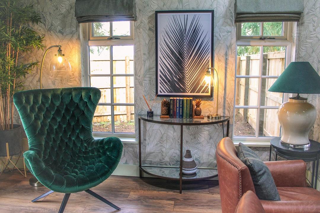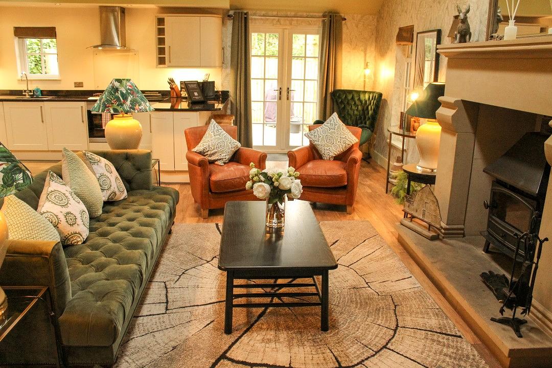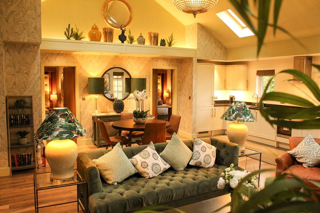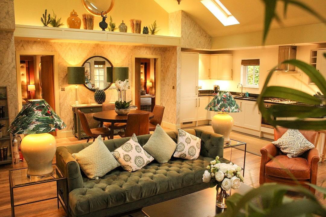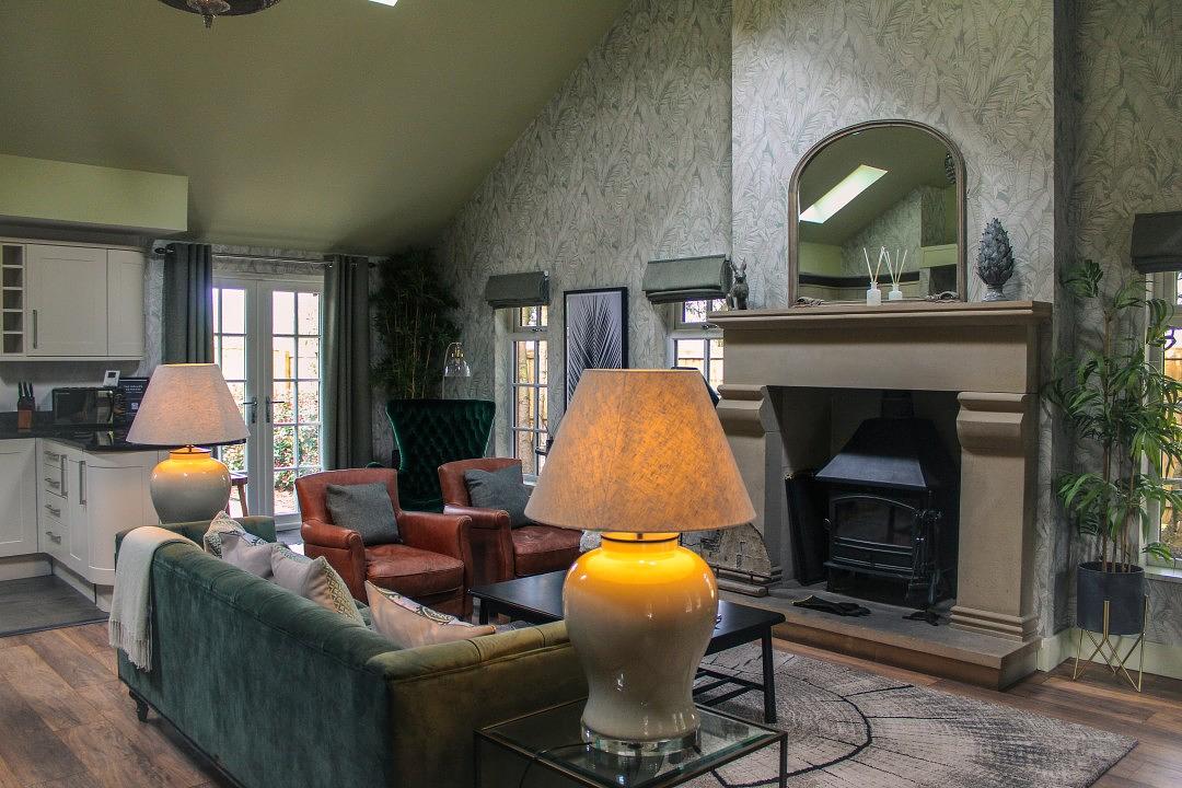 This spacious open-plan living area combines style and comfort in perfect harmony. The fully fitted kitchen, finished with elegant granite worktops, provides everything you need for effortless dining, while the adjacent dining space comfortably seats up to four guests. The inviting lounge exudes warmth and sophistication, featuring sumptuous green velvet sofas and rich leather armchairs arranged around a cosy log burner. A soothing palette of calming greens and natural tones, complemented by oak flooring, luxurious velvet textures, statement chandeliers, and palm-leaf patterned wallpaper, creates a beautifully balanced atmosphere, a contemporary fusion of modern elegance and timeless charm.