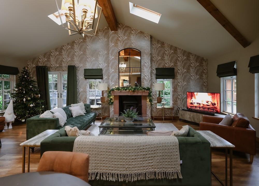 The Noble Fir boasts a spacious open-plan living area, featuring a fully fitted kitchen with elegant granite worktops, a dining space seating up to four guests, and a lounge centred around a cosy log-burning stove set within a stunning locally crafted sandstone fireplace. The lodge’s interior is beautifully styled, creating a sophisticated yet inviting atmosphere.
