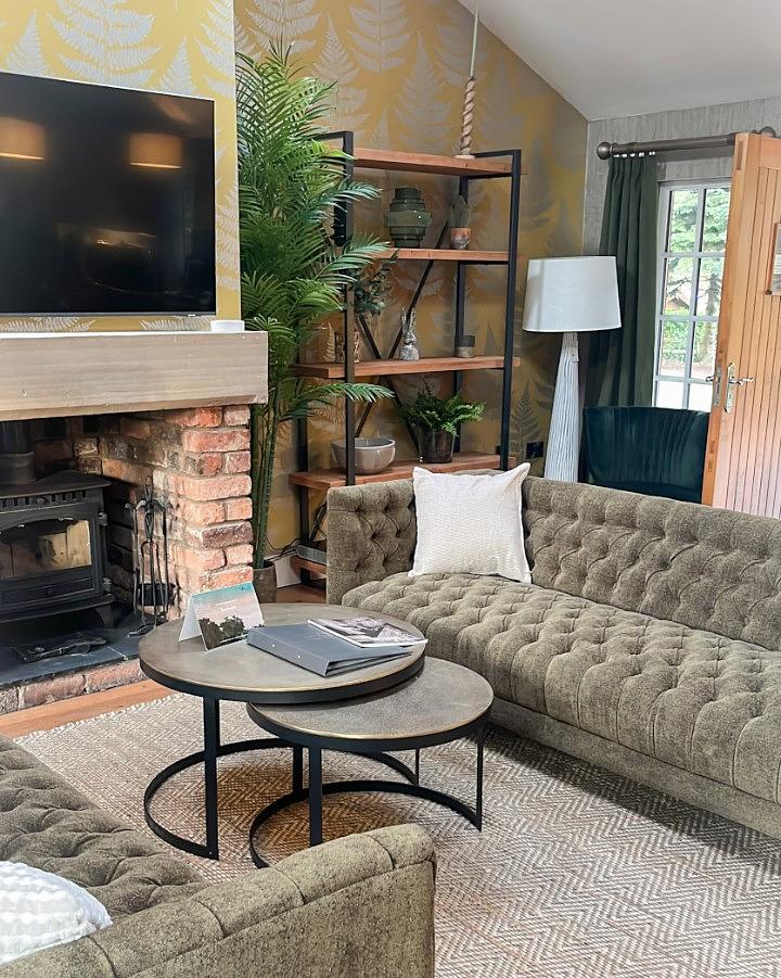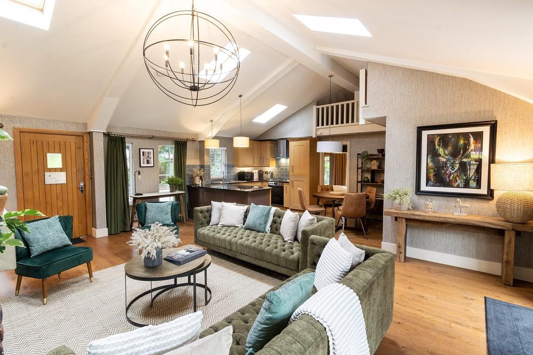 This luxurious forest lodge cabin provides elegant accommodation for up to four guests. Inside, a soothing palette of blues and greys, reflected in the furnishings and sumptuous textured Harlequin wallpaper, creates a harmonious and calming atmosphere, perfect for total relaxation and a true sense of wellbeing.