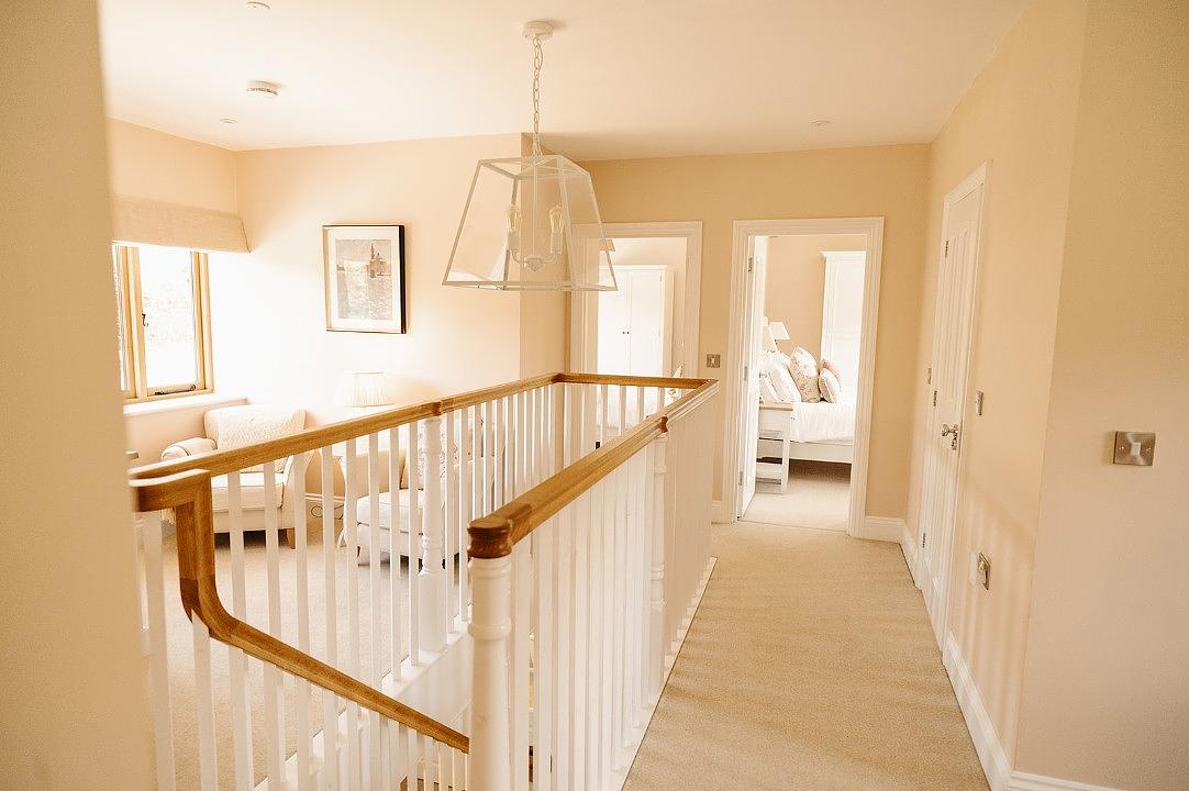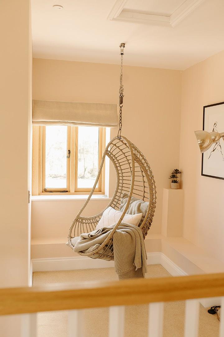 The heart of the home is a spacious and inviting living area, where comfort and style seamlessly blend together. The lounge is filled with natural light, thanks to large windows that frame breath taking views of the surrounding countryside. Comfortable sofas surround a charming brick inglenook fireplace, complete with a wood burner—perfect for cosy evenings spent by the fire. The Smart TV provides entertainment for the whole group, and the relaxed atmosphere makes it the perfect setting for both quiet relaxation and lively socializing. Upstairs, the library landing features a hanging chair and offers panoramic river views, providing a serene spot to unwind with a good book or simply enjoy the tranquil surroundings.