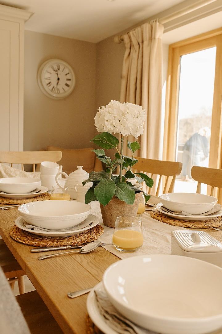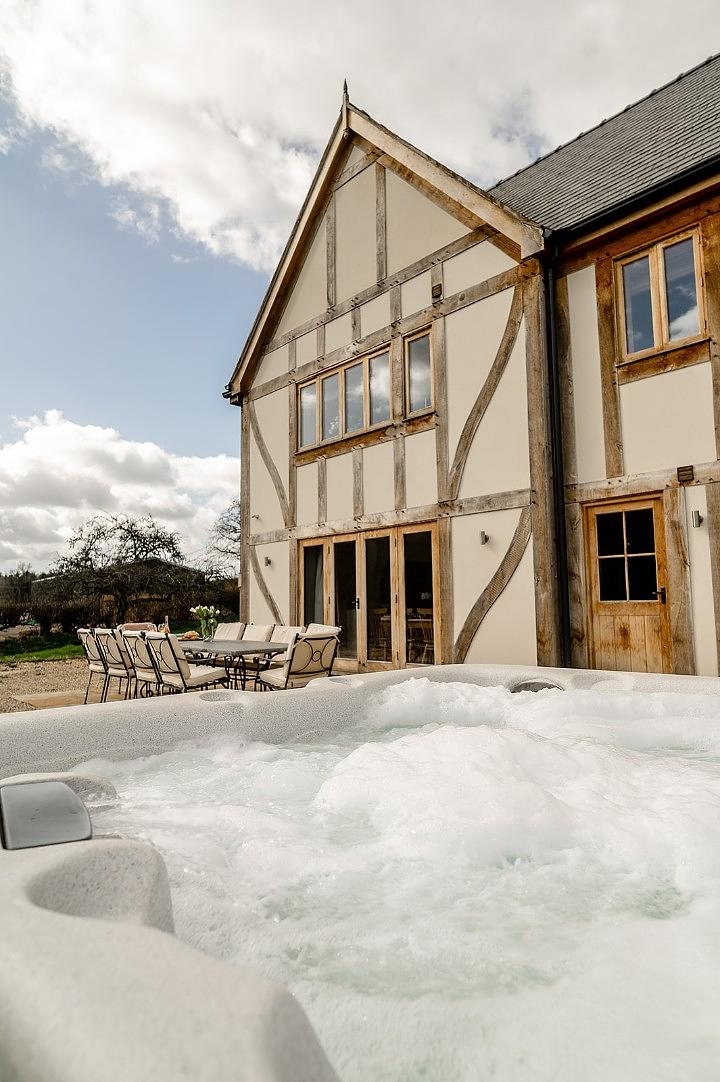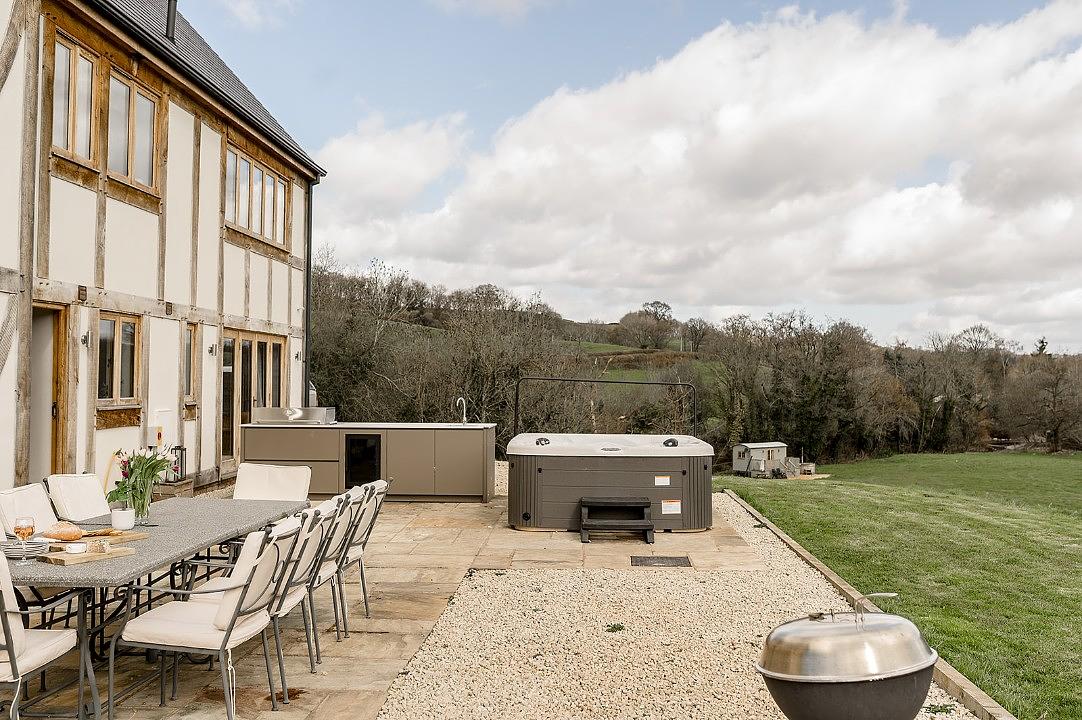 Step inside this beautifully designed countryside escape, where modern luxury meets rustic charm. The spacious interior features exposed beams, underfloor heating, and thoughtfully curated décor throughout. The heart of the home is a large, light-filled kitchen equipped with high-end appliances, including a Range-style cooker, two dishwashers, and a drinks fridge - ideal for preparing and sharing group meals. The open-plan dining area flows seamlessly onto the patio, while the inviting lounge boasts plush sofas, a Smart TV, and a wood burner nestled in a traditional brick inglenook fireplace - perfect for cosy evenings in.