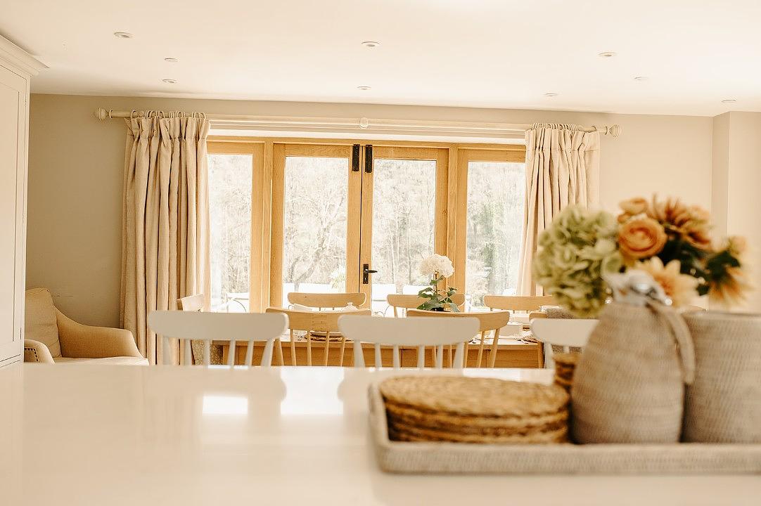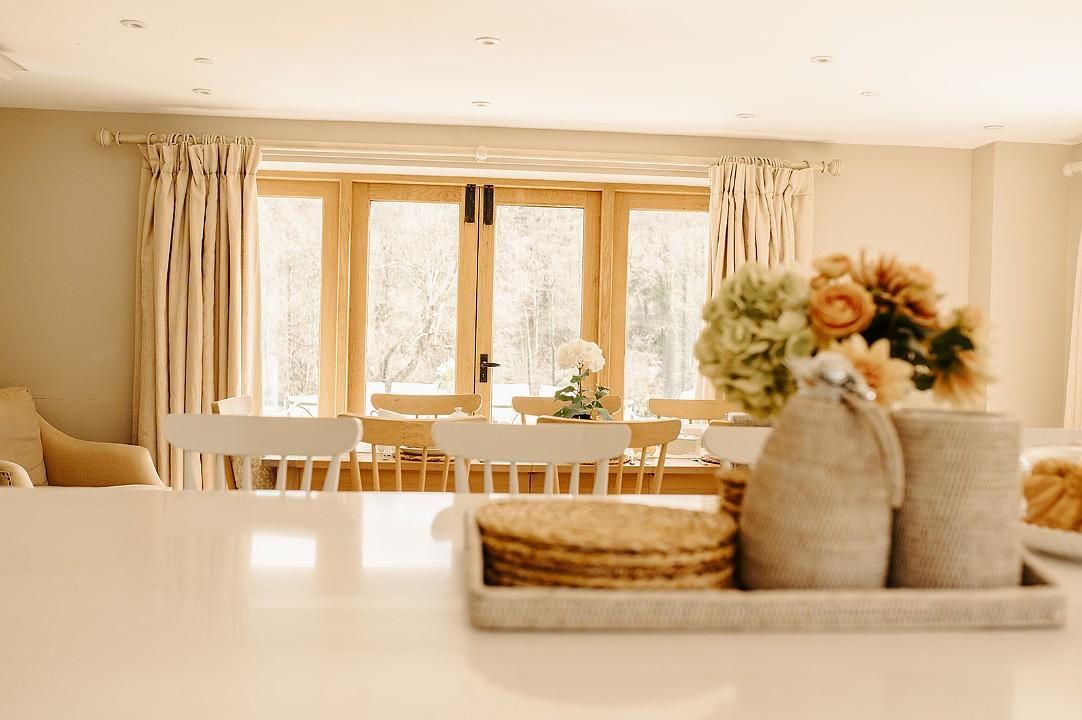 The kitchen is a chef’s dream, spacious and fully equipped to cater for large groups. It features a Range-style electric oven and induction hob, a second electric oven, two dishwashers, a fridge/freezer, and a drinks fridge, ensuring you have everything you need to prepare family meals or festive feasts. The large kitchen island provides ample surface space, while elegant tiled flooring ties the space together beautifully. Adjacent to the kitchen is the dining area, which is perfectly positioned to gather the whole group together for meals. Large patio doors open directly onto the outdoor dining area, allowing easy access for al fresco dining during warmer months.