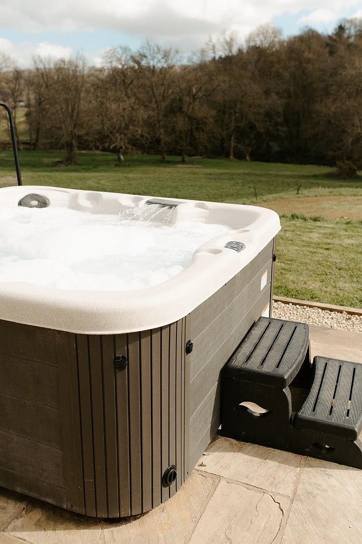 The property is set within expansive private grounds, offering plenty of space for outdoor activities and relaxation. The large garden features a sunny patio area with outdoor furniture, perfect for al fresco dining or simply soaking in the surrounding natural beauty. The charcoal BBQ makes outdoor meals a breeze, while the hot tub provides an extra layer of luxury and relaxation.