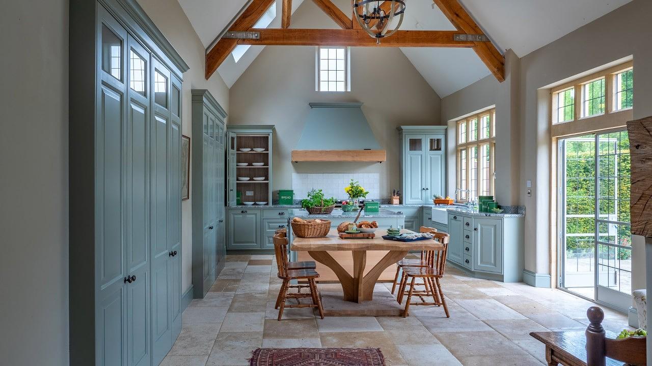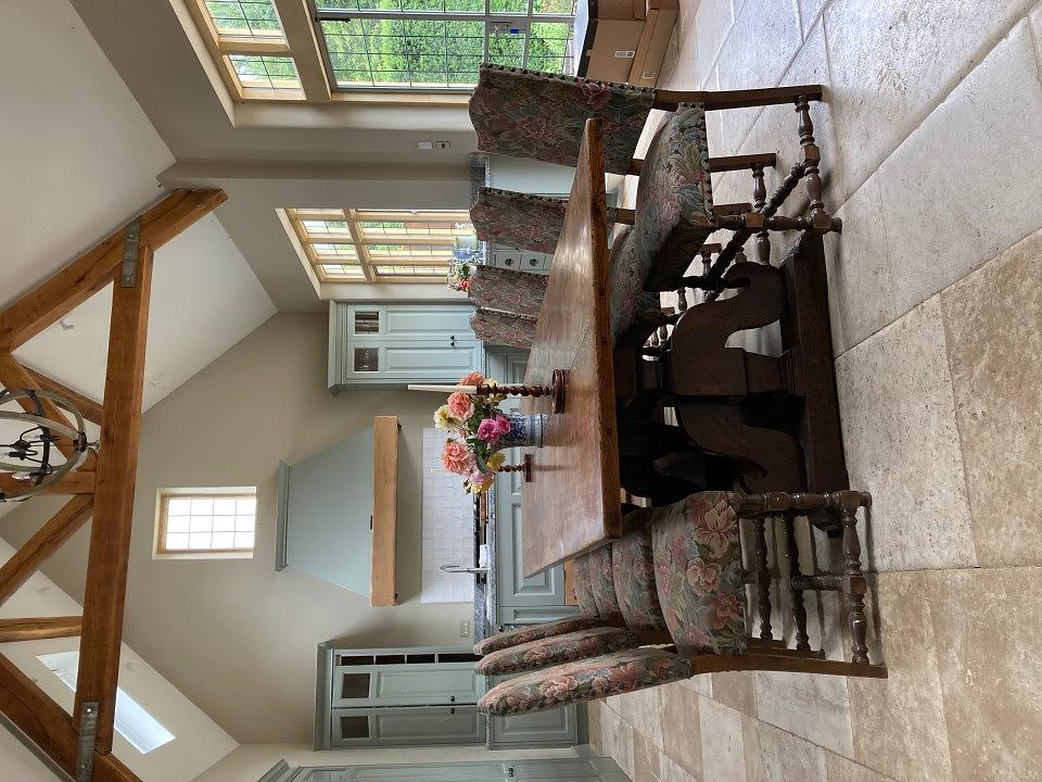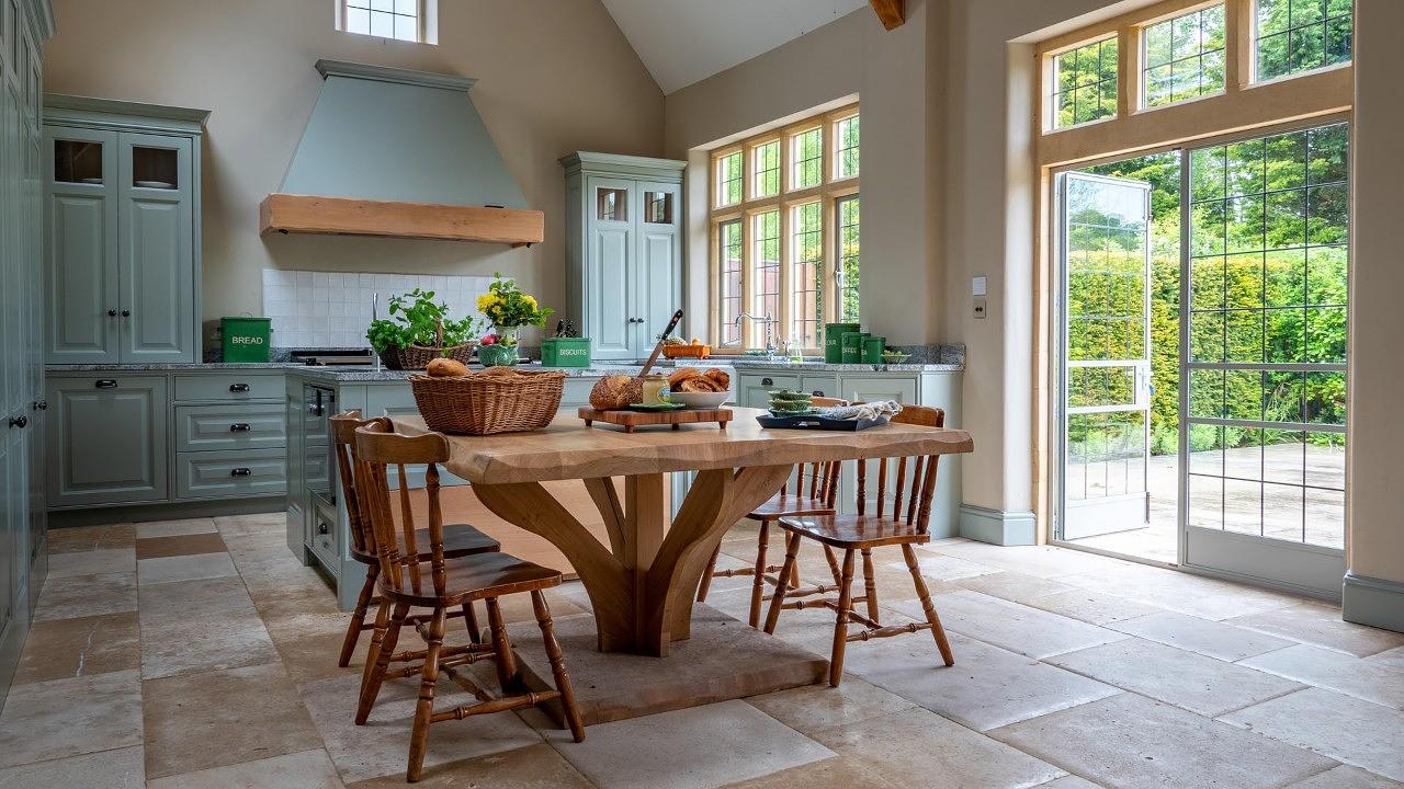 Inside, Laverton Estate offers inviting spaces such as a grand entrance hall with a log burner, a beautiful drawing room with a baby grand piano and open fire, and a cosy snug/tv room. The vaulted open-plan kitchen and dining area is designed for entertaining, with a five-oven Aga, Gaggenau steam oven, wood-burning stove, and a large farmhouse table.