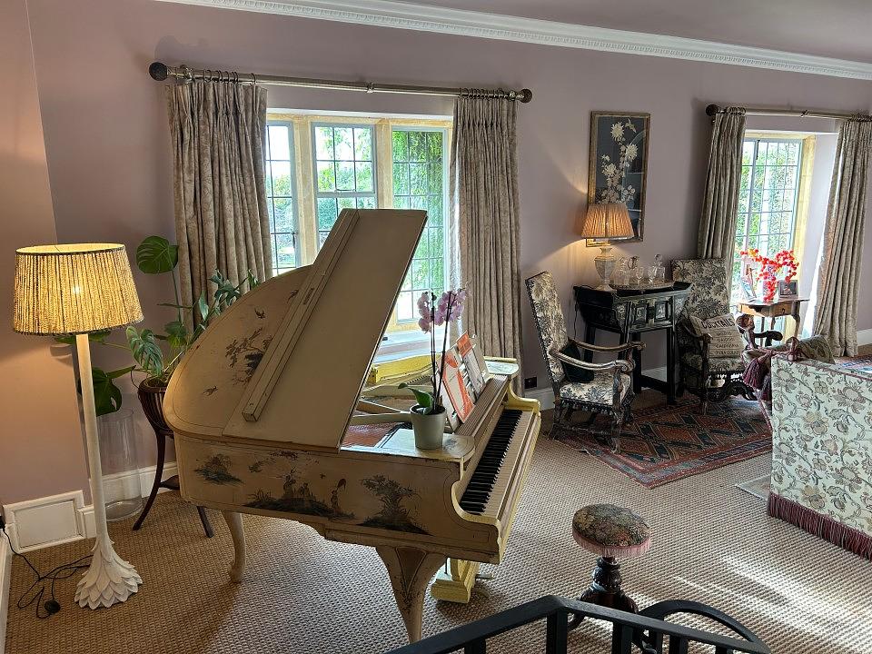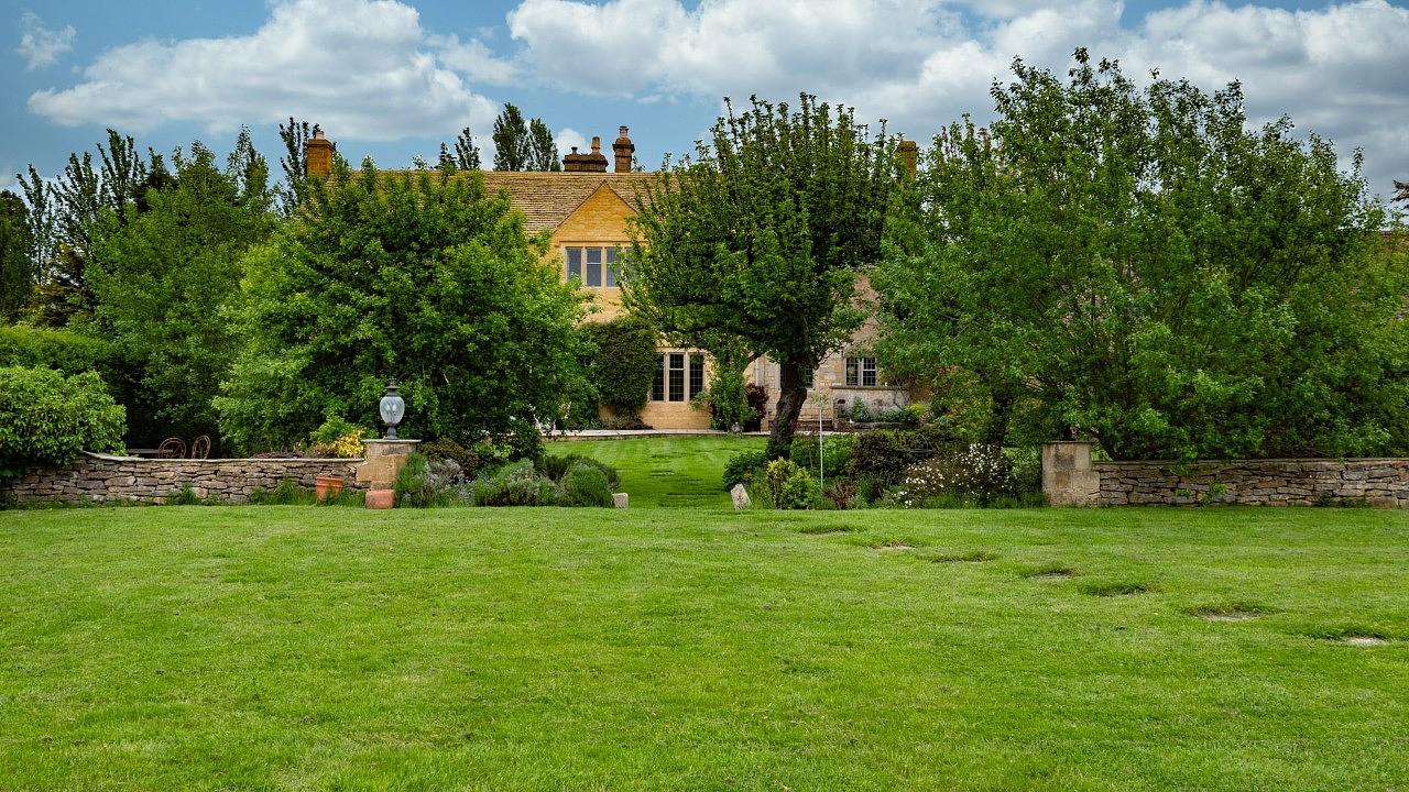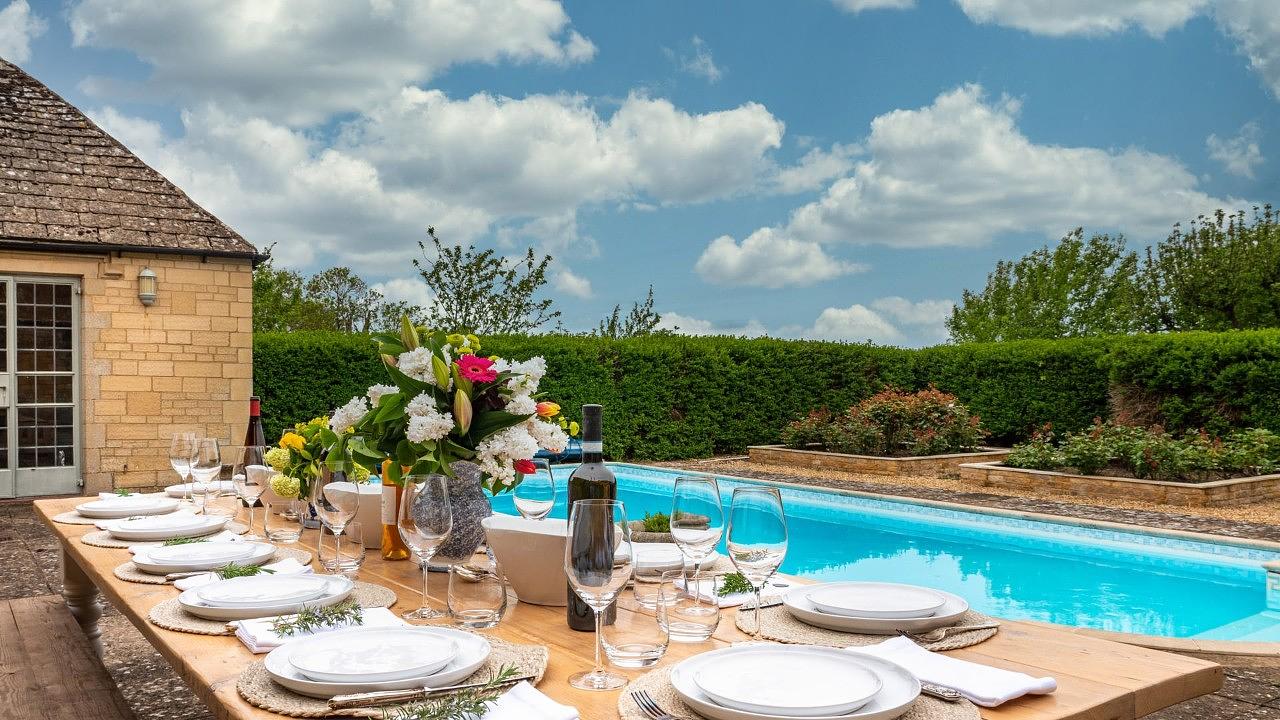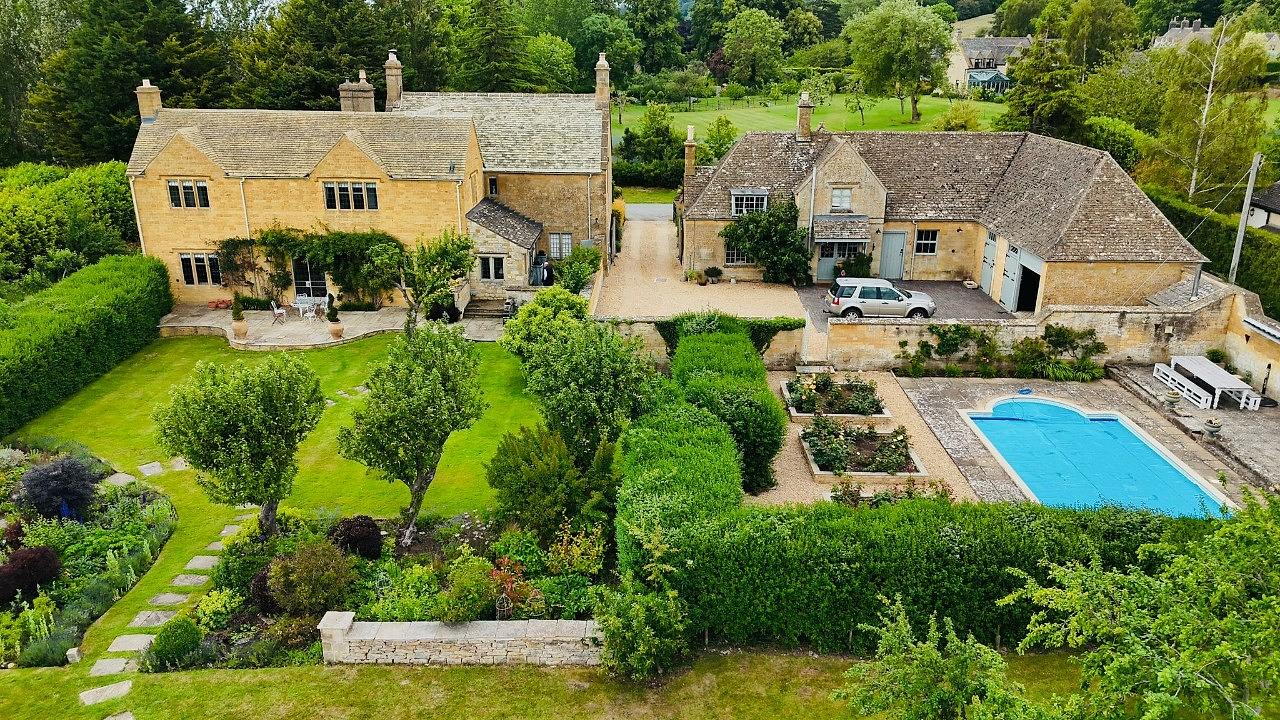 A traditional walled garden houses an immaculate outdoor heated pool (seasonal), a pool house, a Cotswold-stone barbecue, and a covered dining area. The old stable block has been converted into a well-equipped gym, complete with boxing, reformer pilates, Peloton, and yoga.