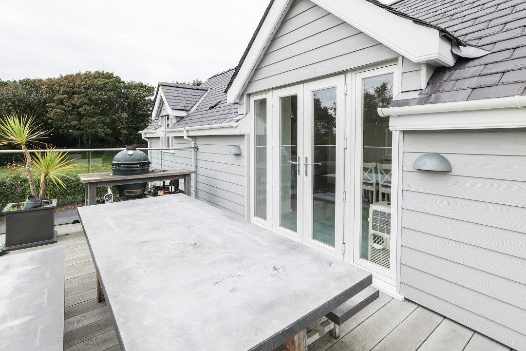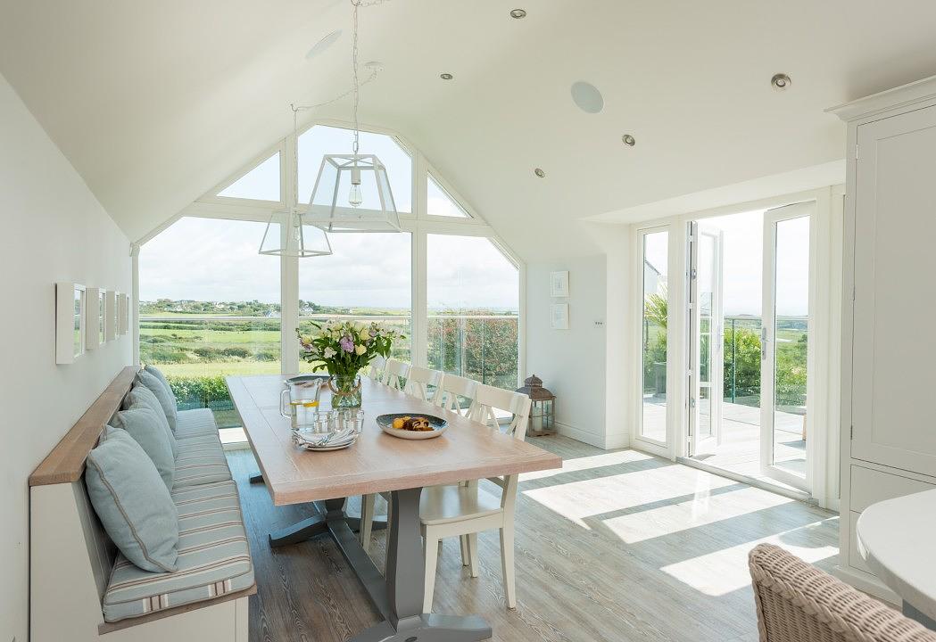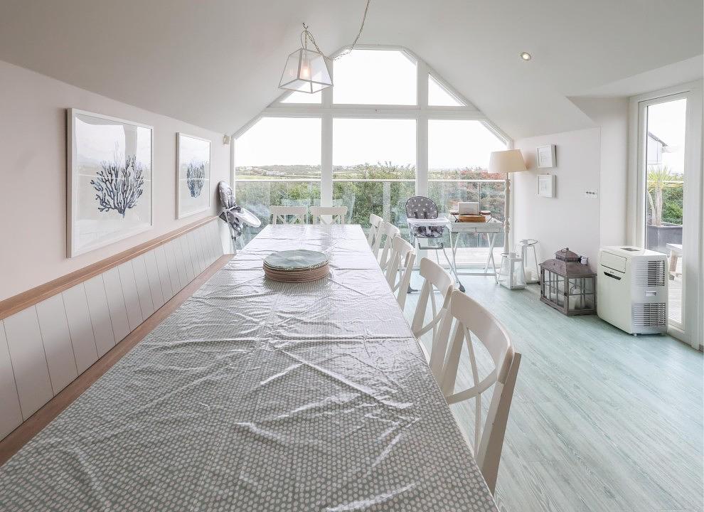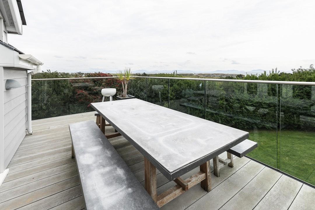 table for 14 with views over the coast and patio door to balcony area with BBQ and table/benches