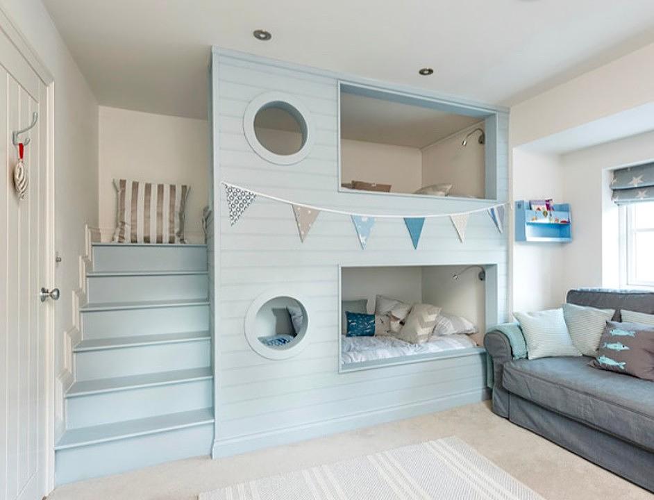 Bedroom 1: Bunk beds (4 feet wide x 7 feet long) and sofa with TV and Nintendo library