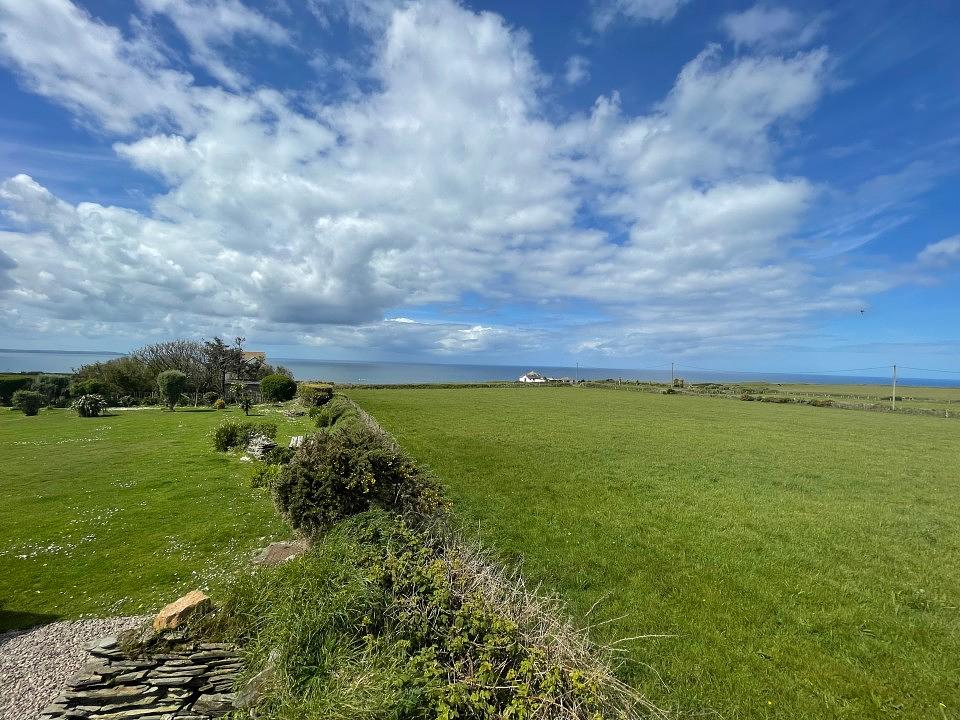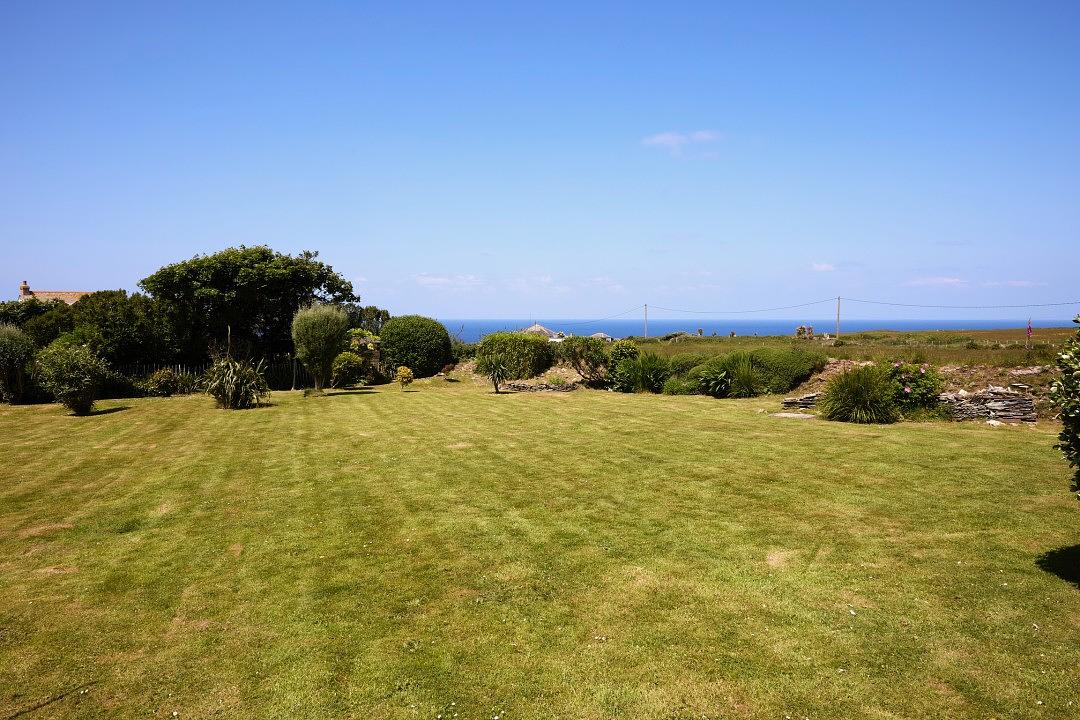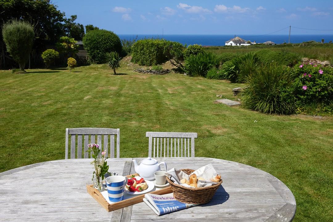 The spacious garden at Merlins Cottage offers a stunning view of the sea and has been recently enclosed to ensure the safety of pets. A charming wooden picket fence secures the front of the garden, while the rest of the boundaries are discreetly fenced with mesh wire within the hedges, preventing pets from wandering onto the road or into neighboring gardens.