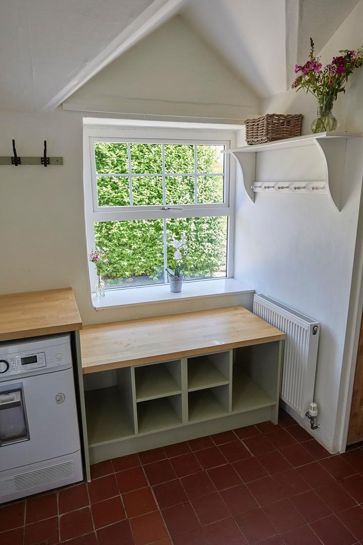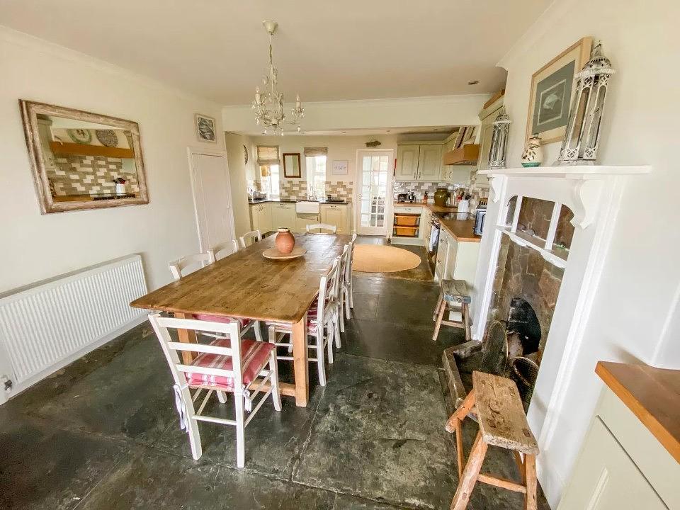 Upon entering the property, guests can conveniently leave their coats and boots in the entrance porch before stepping into the spacious farmhouse kitchen. This charming kitchen features an open fire and weathered flagstone flooring, creating a cozy and rustic atmosphere.