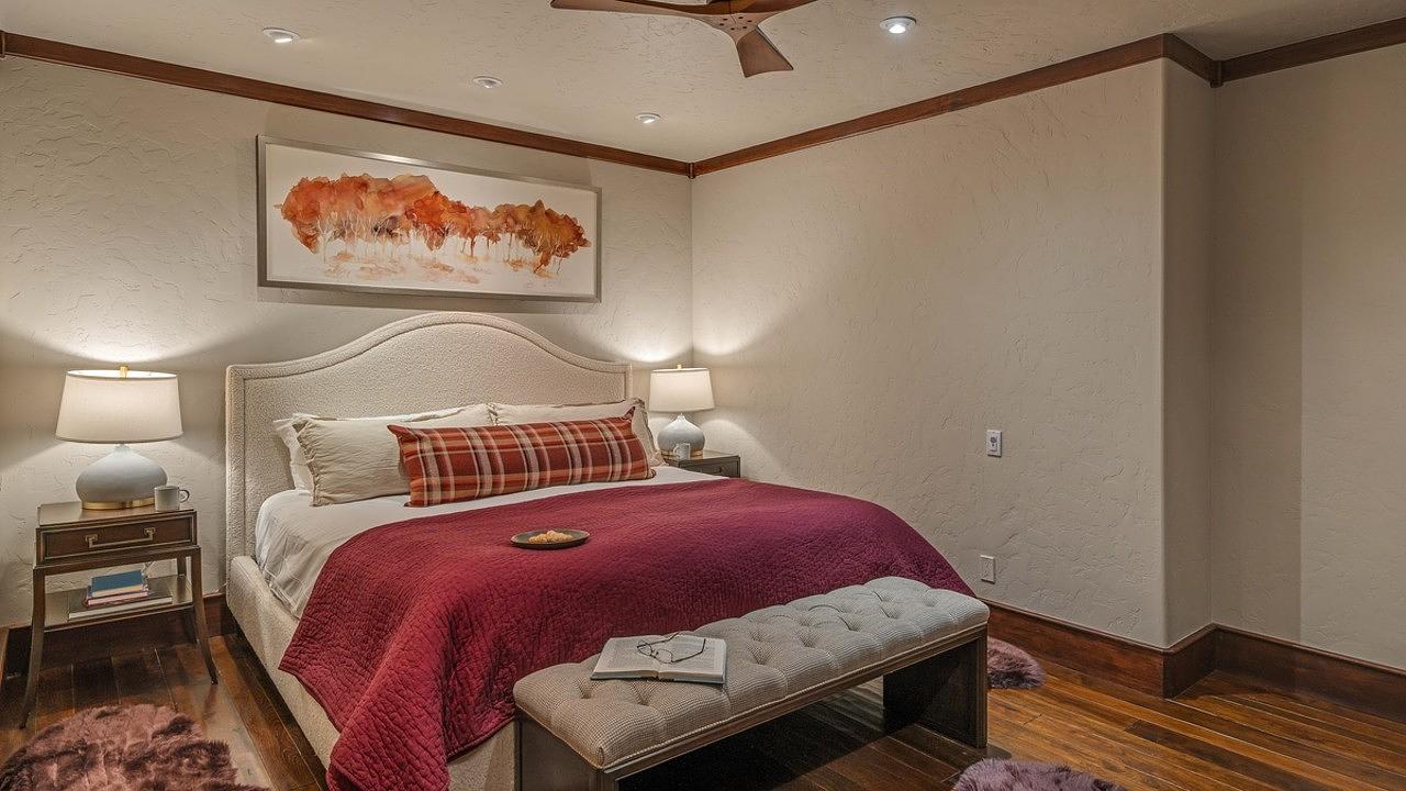 Snowdrift Lodge offers seven beautifully appointed bedrooms, each designed with comfort and style in mind. The primary suite, located on the main level, features a king bed with a hidden pop-up TV, private balcony, reading nook, luxurious ensuite bath with Japanese-style toilet, and a walk-in closet that leads directly to the laundry room and ski-ready mudroom with an equipment warmer.