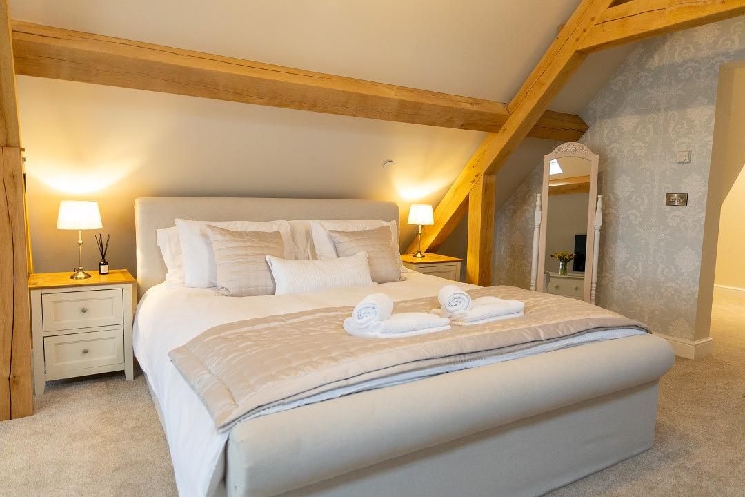 A generous and spacious Suite, blends rustic charm with modern comfort in a beautiful farmhouse aesthetic. Hosting a super king-size double bed, walk-in dressing room space and a contemporary en-suite bathroom with luxurious stand-alone bath and walk-in, multi-jet shower. Perfect for couples or solo travellers seeking a peaceful escape in the beauty of the Welsh countryside.